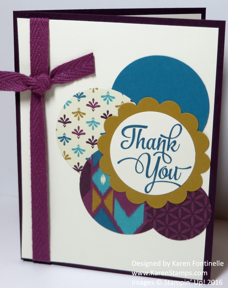 This Bohemian Designer Series Paper is one that I bought but wasn’t that crazy about, so I wanted to use it some more before it retires May 31 and ended up with this easy Bohemian thank you card! I think I saw an idea of punching circles out of the paper and used that inspiration on this card. Just grab various size punches, some larger ones and some medium and small – whatever you like! Besides the designer paper, I also punched a piece of cardstock in the color that coordinated with the paper, Island Indigo. I also used a Scallop Circle Punch for the background of the greeting. The greeting is from Tin of Cards Stamp Set. I sure do love that stamp set!