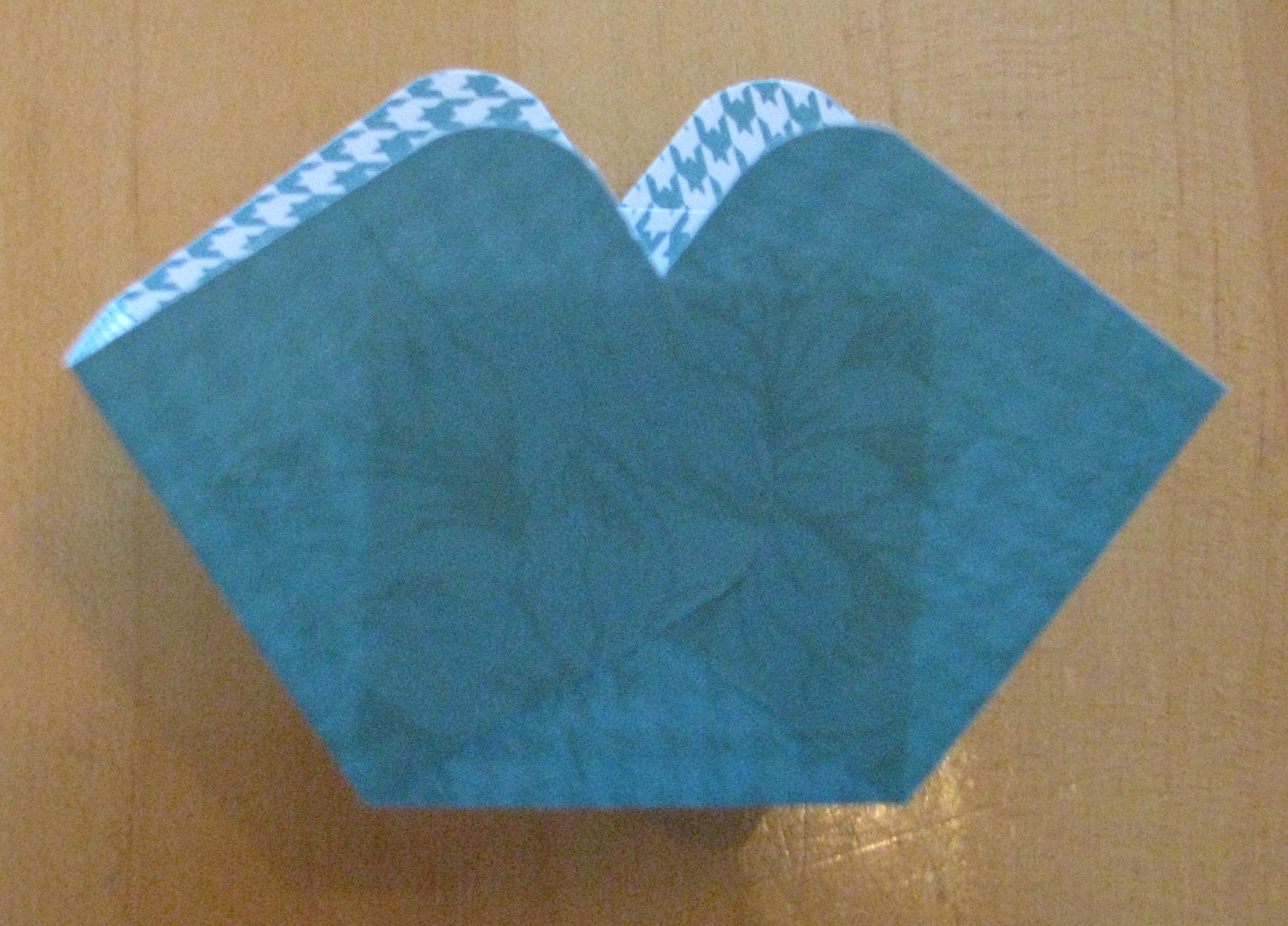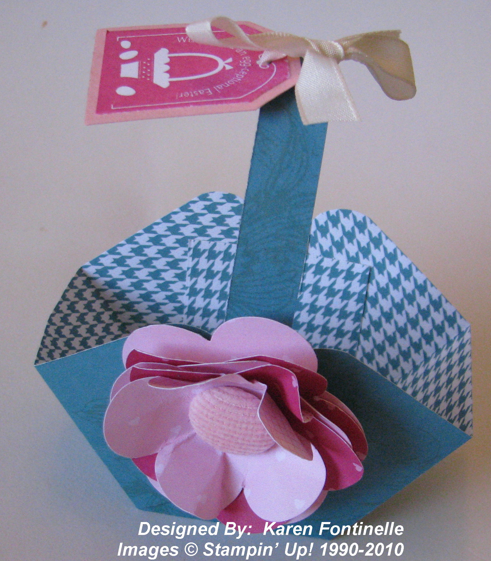 Then fold up the sides to form your basket. You have a little leeway on how you position your sides. I glued with Tombow Multi. You could use Sticky Strip or you could use some kind of brad to hold the sides together. Cut a strip to make a handle, then decorate your basket!