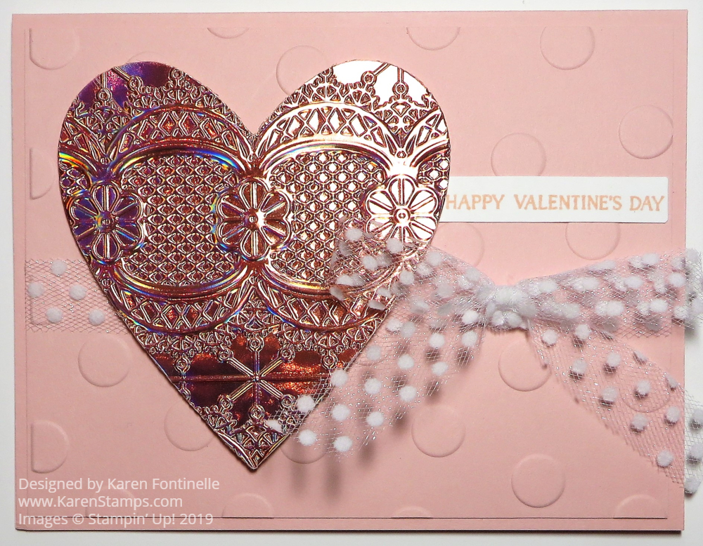 The foil heart is quite large so it fits nicely on this card. I put it off to the side so I could use the Whisper White 5/8″ Polka Dot Tulle Ribbon to wrap across the front and tie in a bow. I love this ribbon!