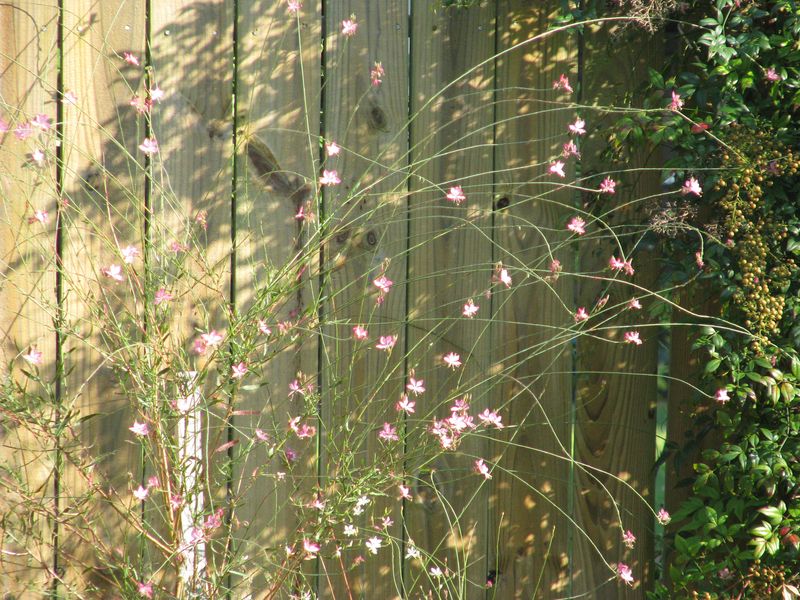 We have lots of pretty periwinkles blooming in our backyard right now as well as some cute, delicate little pink flowers, Gaura, back by the fence.