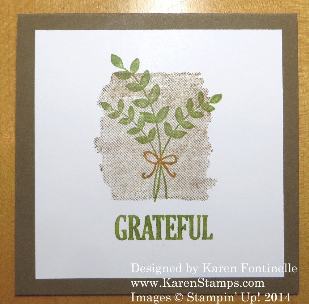 If you are looking for an easy to make card for fall or Thanksgiving, this one fits the bill. I just grabbed a 4″ x 8″ piece of Soft Suede card stock, folded it in half to make a 4″ x 4″ card base, and stamped on a Whisper White layer. I used the For All Things Stamp Set, which I just love! I inked up the little background stamp with Soft Suede but stamped it off on scrap paper before stamping on the card. That way I could stamp the bouquet of greenery right over it. I stamped it in Old Olive ink but then used a Pumpkin Pie Stampin’ Write Marker to color the little ribbon on it. You could also adhere a little linen or Baker’s Twine bow if you like. The word “Grateful” comes from part of a stamp that I just colored the one word with the Old Olive Marker. Handy things, those Stampin’ Write Markers!