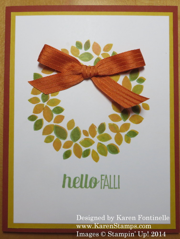 We might all think the Wondrous Wreath Stamp Set is only for making Christmas cards, but that is absolutely not the only use we would have for it! As you can see, the Wondrous Wreath can be made into a fall wreath card just as easily as a Christmas wreath. Simply stamp the wreath in a light fall color and then stamp the overlay leaf stamp in a darker fall color.