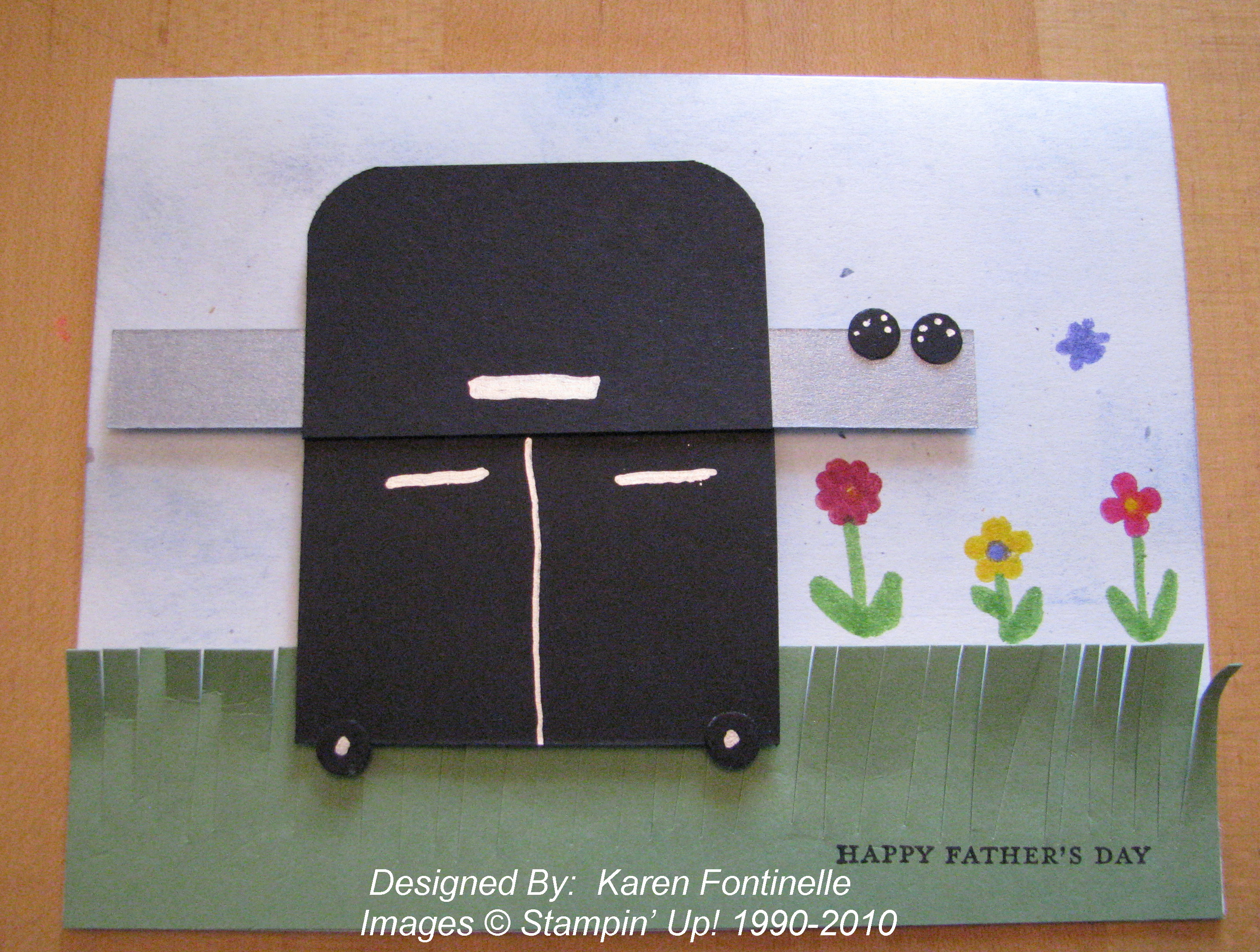 I thought I would make a Father's Day card for my husband in honor of our new Weber grill we bought recently! Lots of people were making punch art bbq grills either for Father's Day, July 4th, or bbq party invitations, but our grill is a a different shape. I just cut rectangles and rounded the corner of the grill top and used my Zig Painty pen to draw in the handles and doors. I stamped the flowers and butterfly with the new Itty Bitty Bits stamp set in the Summer Mini. and the sentiment with Teeny Tiny Wishes #115370. Just a quick little card!