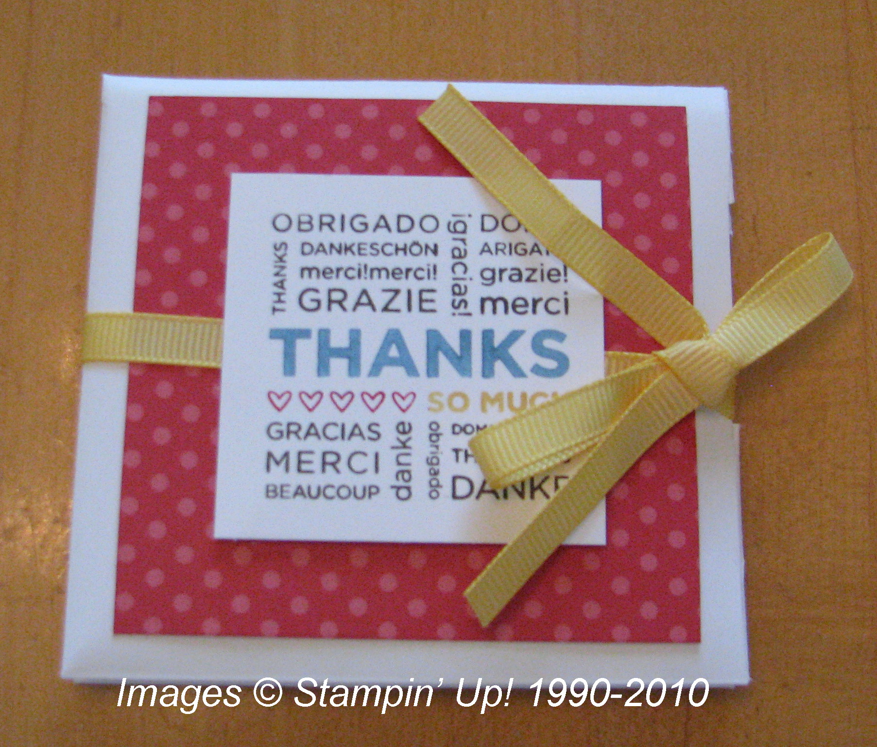 This is a Small Open-End Envelope #107286 with the long side slit open so that small cards and envelopes can be inserted. I would show you the inside but I made a "slight" boo-boo with the circle punch (not reading the directions!). I can fix that later, but haven't yet! You can always fix things in papercrafting! The stamp is the single stamp, "So Many Thanks" #120173.