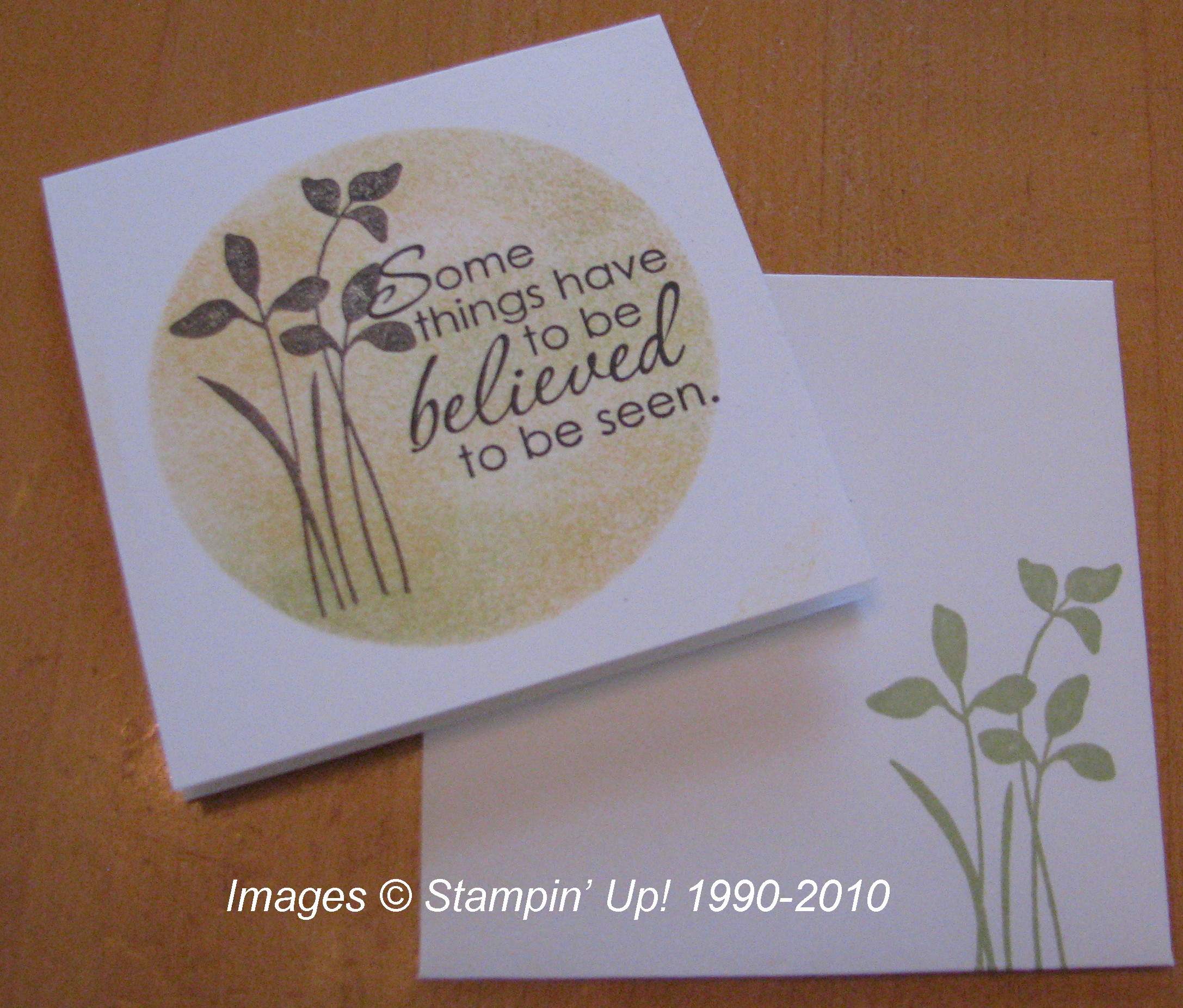 They gave us a mask to use…the negative paper from cutting Circles #2 with the Big Shot….so we could sponge three colors of ink for the background and then stamp with the beautiful new set "Just Believe", page 109 in the catalog. This is a 3×3 card and Mini Square Whisper White envelope.