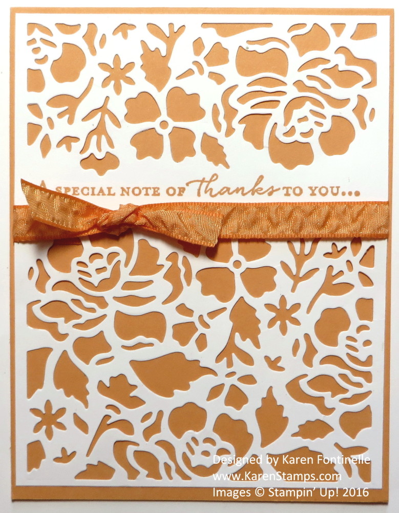 I was really anxious to play with the Detailed Floral Thinlits Dies and my Big Shot as soon as I got them, and this Floral Thinlits Thank You Card in Peekaboo Peach is one of the results. I actually started using the Floral Thinlits with the Floral Boutique Designer Series Paper, but of course these Floral Thinlits are beautiful with other colors as well, such as this new In Color Peekaboo Peach. The Peekaboo Peach 3/8″ Ruched Ribbon is gorgeous to use on the card! In fact, the ribbon is so gorgeous, that it is on backorder at the moment. As I write this, it is due to be back in stock around July 11th. You really do have to get your hands on this beautiful ribbon as soon as it is available! The thank you greeting is stamped with the Floral Phrases Stamp Set. Right now the Clear-mount version is backordered but you can purchase the Floral Phrases Clear-Mount Bundle and get both the stamp set and the Thinlits – and save 10%. You can also buy the stamp set in wood-mount. While it is inconvenient and disappointing to have backordered products, it shows that Stampin’ Up! has some real hits in the new catalog!