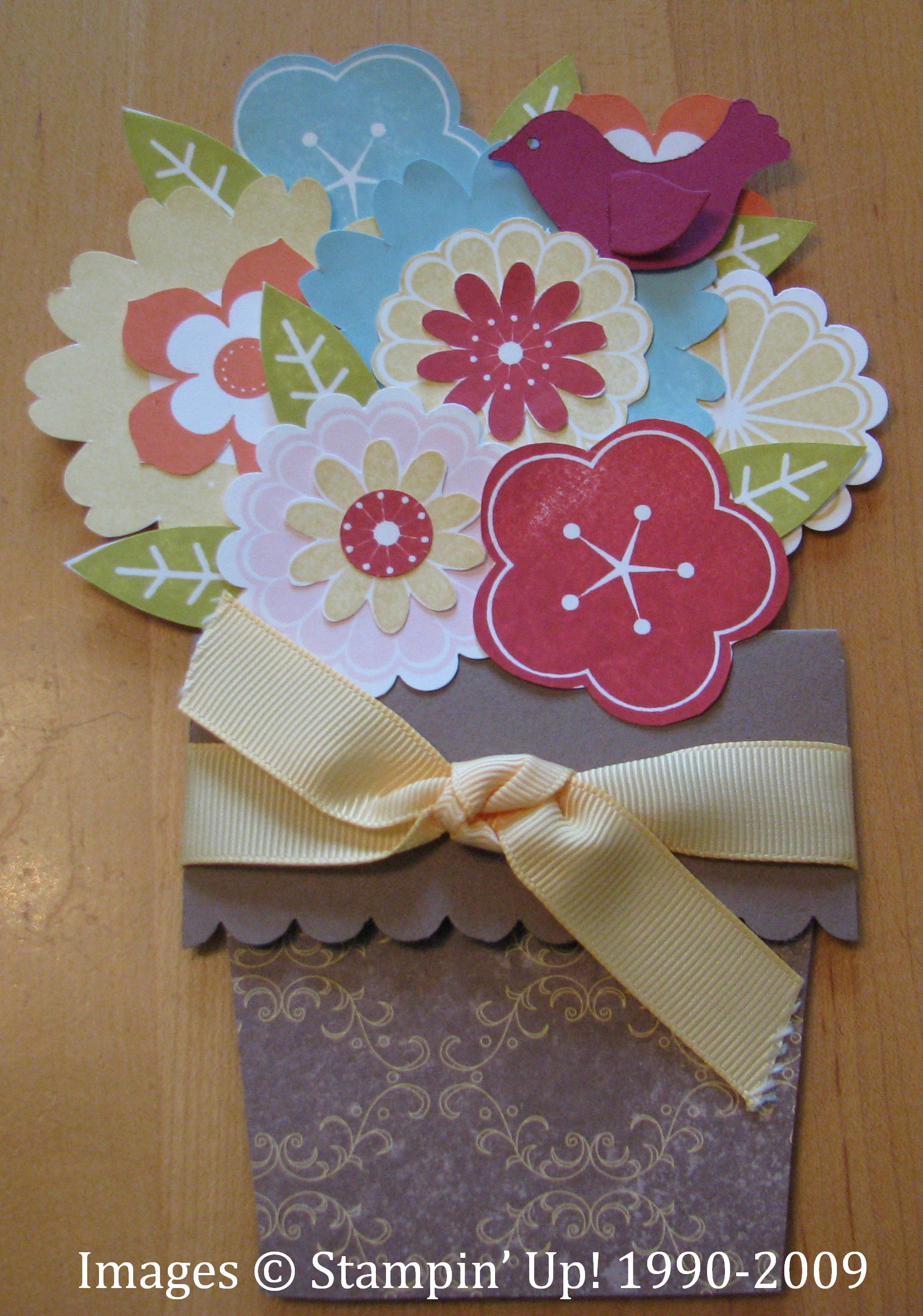 These cards are all the rage now! Pull on the flowers and your greeting goes on the tab inside. This sample was made with the stamp set "Petal Pizzazz", which required lots of cutting, but was fun nonetheless. The bird adds a cute touch, made with the Birds and Blooms die cut.