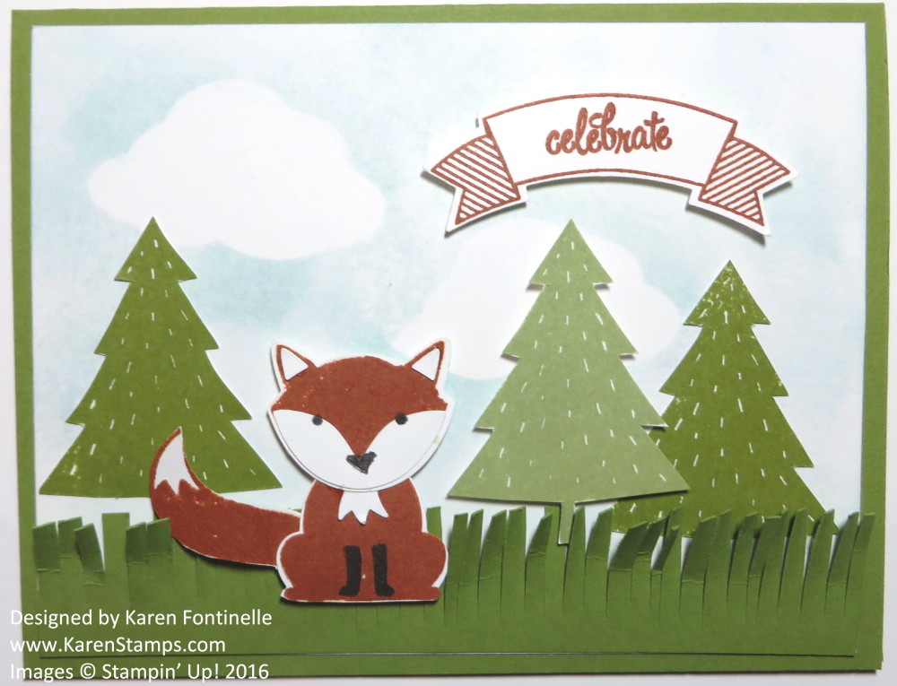 The card base is Old Olive cardstock as well as the grass cut with the Fringe Scissors. The trees are stamped from the Foxy Friends Stamp Set and I just cut those out by hand, although there are coordinating framelits, Perfect Pines, if you already have those. After assembling the pieces from the Fox Punch to make my fox, I popped him up on Stampin’ Dimensionals as well as one tree. The sky in the background is just sponged in Soft Sky ink using a punched cloud from the Tree Builder Punch that coordinates with the Sprinkles of Life Stamp Set (last year’s Ronald McDonald House Charities Stamp Set, and so popular it is still available THIS year!). Just put down the cloud and sponge around the edges of it. So easy!