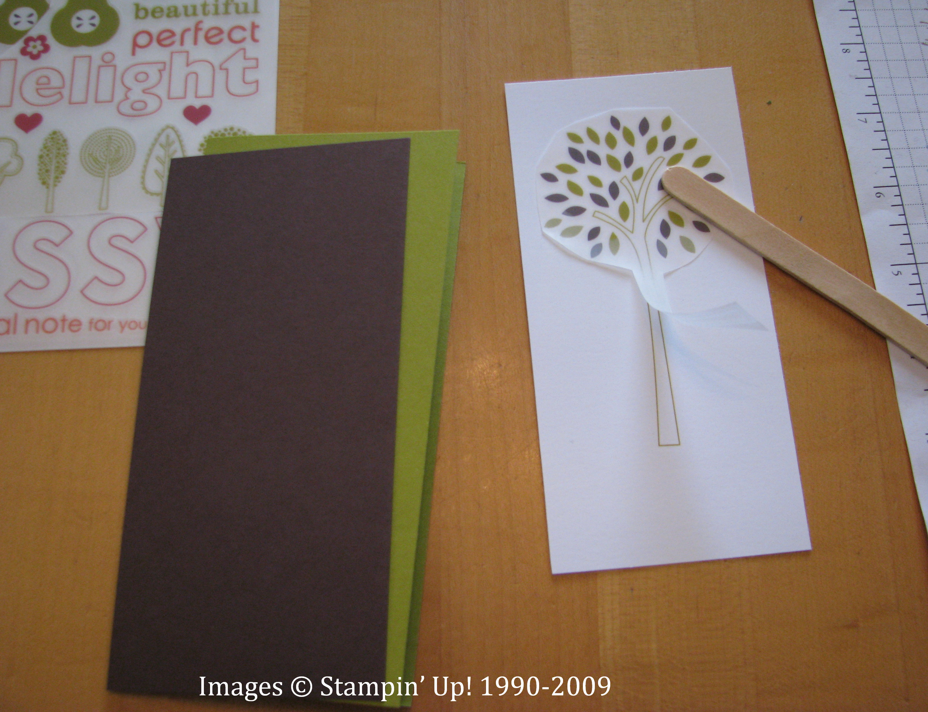 Remove the backing sheet, place the rub on on your cardstock and rub with the "tool" (popsicle stick!). You can almost see the image change just a tiny bit. Peel rub on off carefully peeking underneath to make sure you didn't miss a spot.