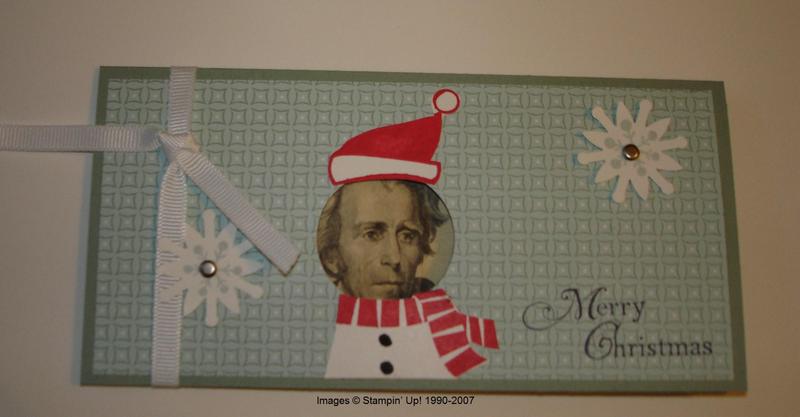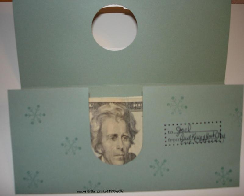 Ok, this really isn’t for "funny money" of course, but I think it is really a cute idea! I think you could adapt the Christmas idea for any other occasion, too. This idea came from a fabulous Demo, JanTink, on her blog, who figured out how to punch the holes in the right place and how to make the whole idea work. I just used different Designer Paper and the Snow Blossom Punch. The stamp set is the retiring Cold Play.