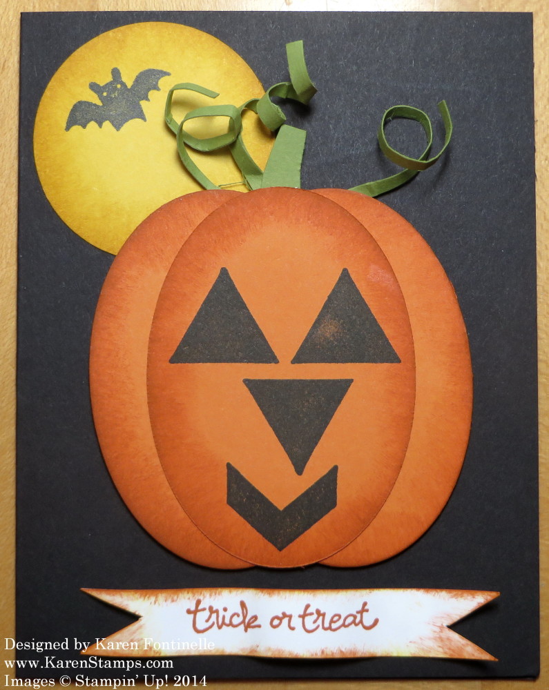 I thought the card required a moon, so I used the 2″ Circle Punch (could have even used a larger one!) to punch a piece of Crushed Curry, sponged the edges, and stamped a little bat from Freaky Friends. The greeting is from the stamp set Good Greetings. Right now you can get that stamp set free with a $300 order of your own or hosting a $300 workshop with friends through the end of October.