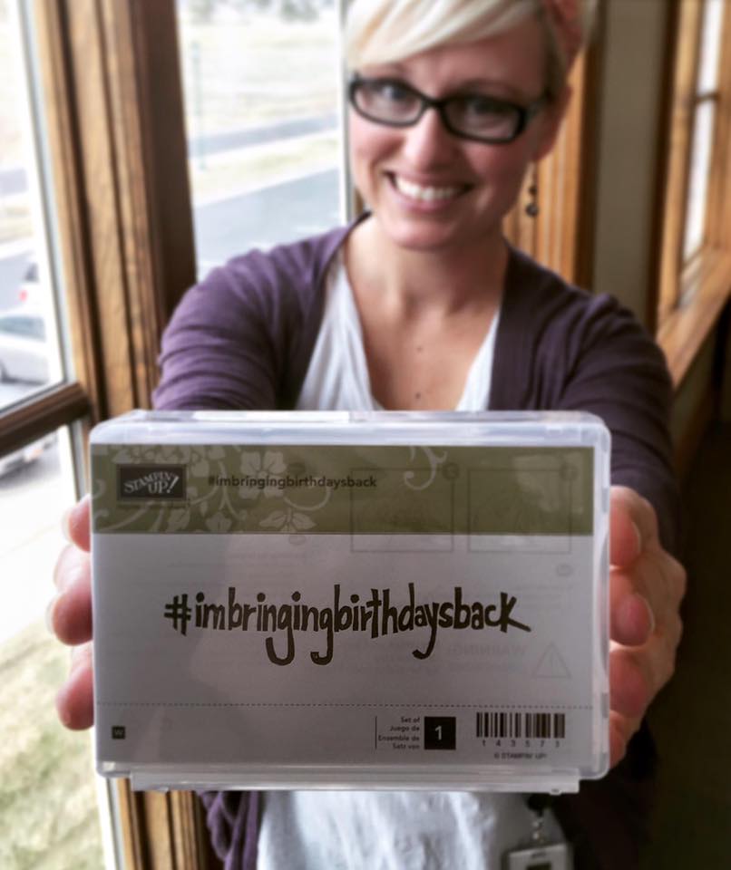 Shannon West, from the Stampin’ Up! Home Office and one of our favorite presenters at Stampin’ Up! events, awhile back decided to do something about this and started sending birthday cards to friends and family and received hundreds of requests on her Facebook page for a birthday card in the mail. She actually made a stamp with the hashtag #imbringingbirthdaysback. Sara Douglass, Interim CEO of Stampin’ Up!, asked how Stampin’ Up! could support her effort and ended up making the stamp Shannon had designed. Last week the stamp was released, but it sold out in only four hours! Today it is back in the Online Store and you can put it on your regular Stampin’ Up! order!