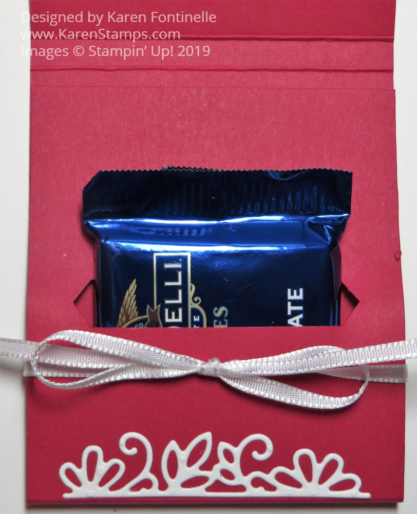 Use the Classic Label Punch on the bottom flap, inserting as far as you can, to punch the opening for the chocolate. This should be big enough for the candy. If you are using the retired Word Window Punch and need a wider opening, just punch a little bit to the side to make the opening larger. Flip the flap up and adhere, preferably with Tear & Tape Adhesive, just at the top. Check to see that the bottom fold/score lines are flat. Insert chocolate to make sure it fits.