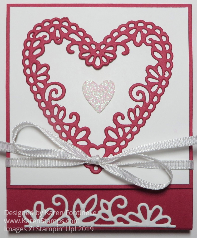 Decorate the front flap of the candy holder however you like. For my sample, I used the fancy heart die in the Be Mine Stitched Framelits Dies. I love that heart! The front of the candy holder is 2 3/4″ x 2 3/4″ so I cut a layer of Whisper White just 1/8″ under that instead of 1/4″. You could do either. I also love the little swirly die cut in the set, so I cut that and adhered it to the bottom of the candy holder. I used the Multipurpose Adhesive Sheets for these two pieces. They are handy to use for small pieces that would be difficult to glue…..IF you remember to use them!