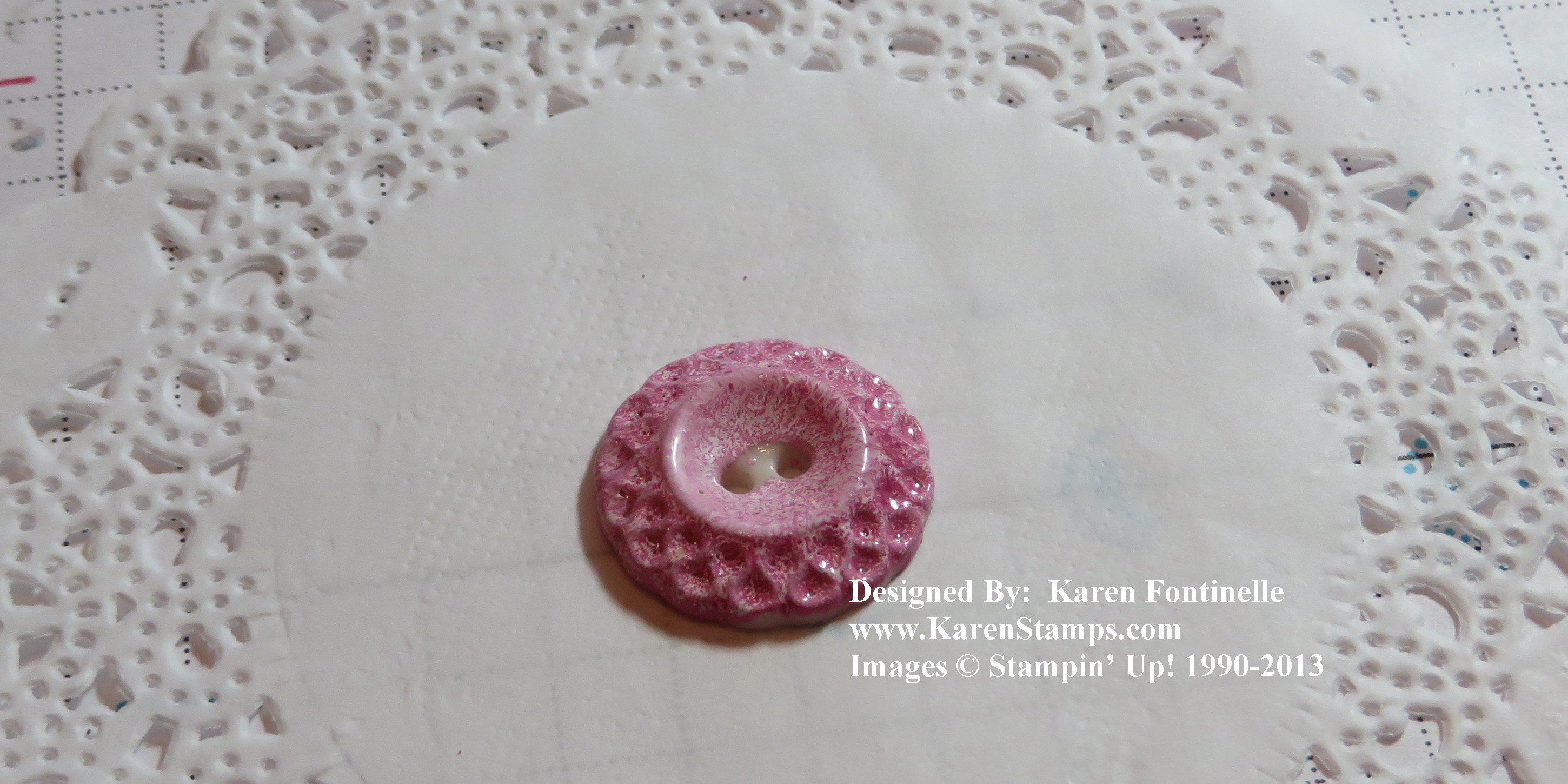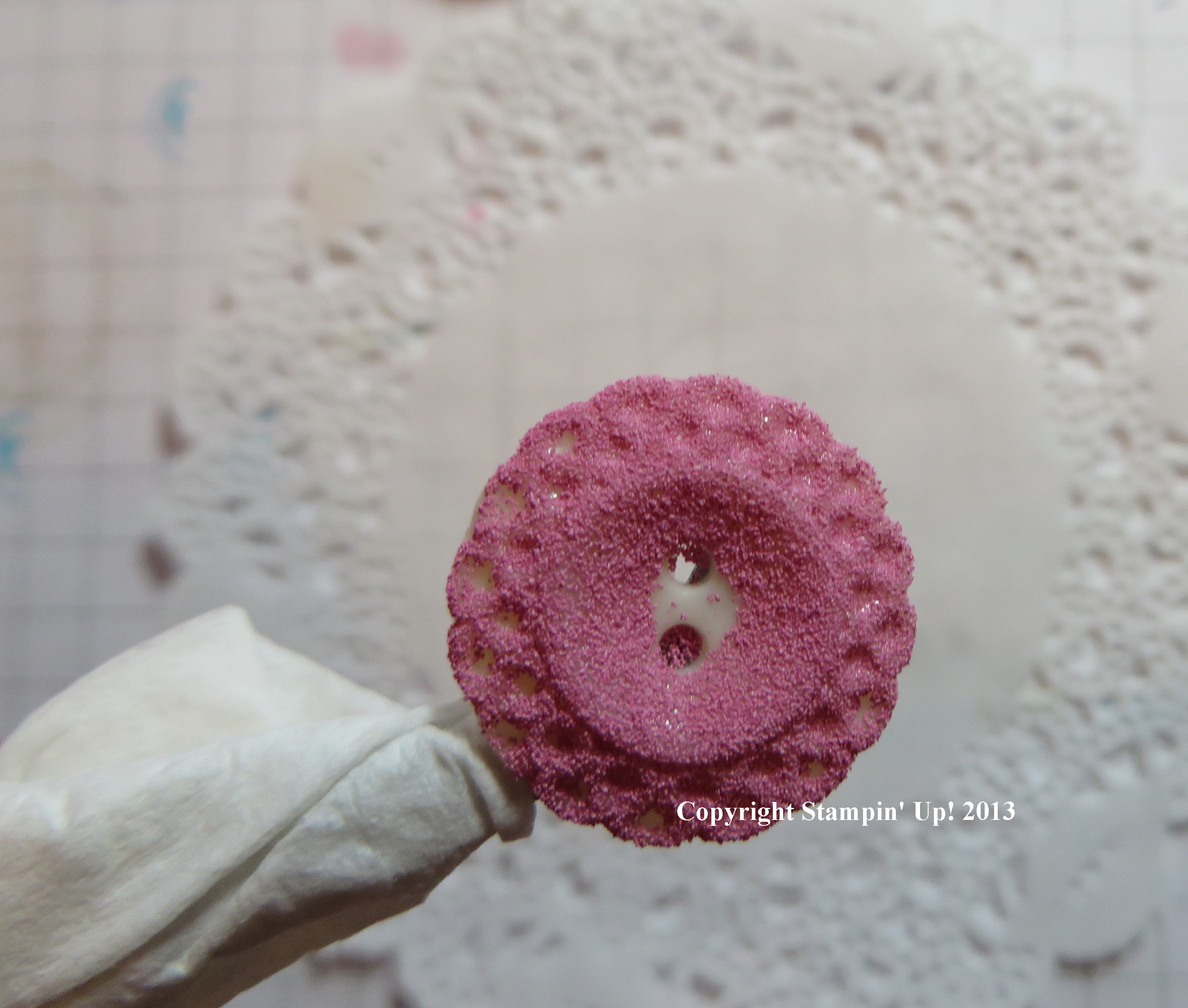 I did a lot of fun things on this card! The button (Very Vintage Buttons) in the middle of the flower started out plain. Since I already had some Melon Mambo Embossing Powder, I decided to try embossing the button! I put some Glue Dots on the back of the button so I could hold it from the back with my long tweezers. You could use anything you had. I dipped it onto a Versamark Ink Pad and then embossed with the embossing powder and Heat Tool! I like the way it turned out!The very center didn’t pick up any Versamark but that is covered with the Baker’s Twine bow.