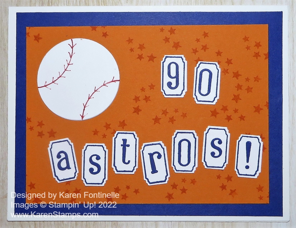 Here is another baseball card I made to celebrate the Astros, even using another alphabet stamp set several years back! If you have an alphabet stamp set, you can do a lot of things with it when you don’t have the proper greeting. But you can also use words like “Celebrate” or “Hooray” and others when you don’t have a baseball or World Series stamp or name of the team! Stars, in stamps or dies, are always great to use!