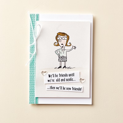 Let’s start with the good! Here is a new photopolymer stamp set, Just Kidding, released this month by Stampin’ Up! The designer of this stamp set said she created it to honor her long-time friends and their journey through life together with lots of laughter. I’m sure we can all appreciate that and know that probably the older we all get, the more we appreciate our dear friends. Now you can enjoy making funny and endearing cards to send to those special people with this new stamp set!