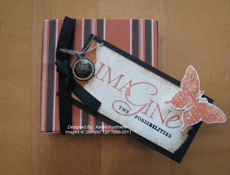 For the graduation gift tag, I’ve found that the stamp set Word Play on page 147 of the Stampin’ Up! Idea Book & Catalog (available in wood- or clear-mount) has great expressions to use for graduation. Use your markers to color the stamp different colors if you like to get a multi-colored image. I sponged the edges, tore the end, added a folded over torn piece and Antique Brad, plus stamped a small butterfly from the SAB set “Bliss”. If you need a larger gift bag or box, make a nice tag that will become a graduation keepsake.