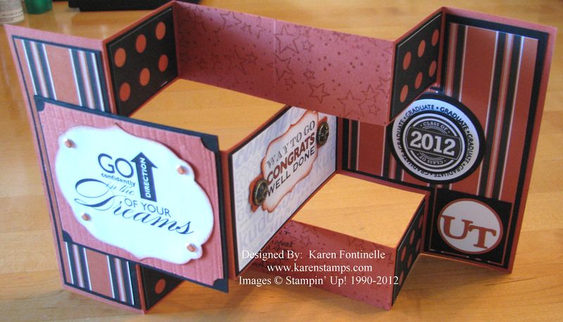 When your son is graduating from college and you make cards, you want to make an extra-special graduation card for him! After thinking about many different designs, I decided on this tri-shutter card. I love how it opens up yet is simple to make. This card is a combination of current and retired stamps, wheel, paper, and embellishments…even paper from the school bookstore scrapbook package. Oh, and let's not forget using My Digital Studio to print some images for the card!