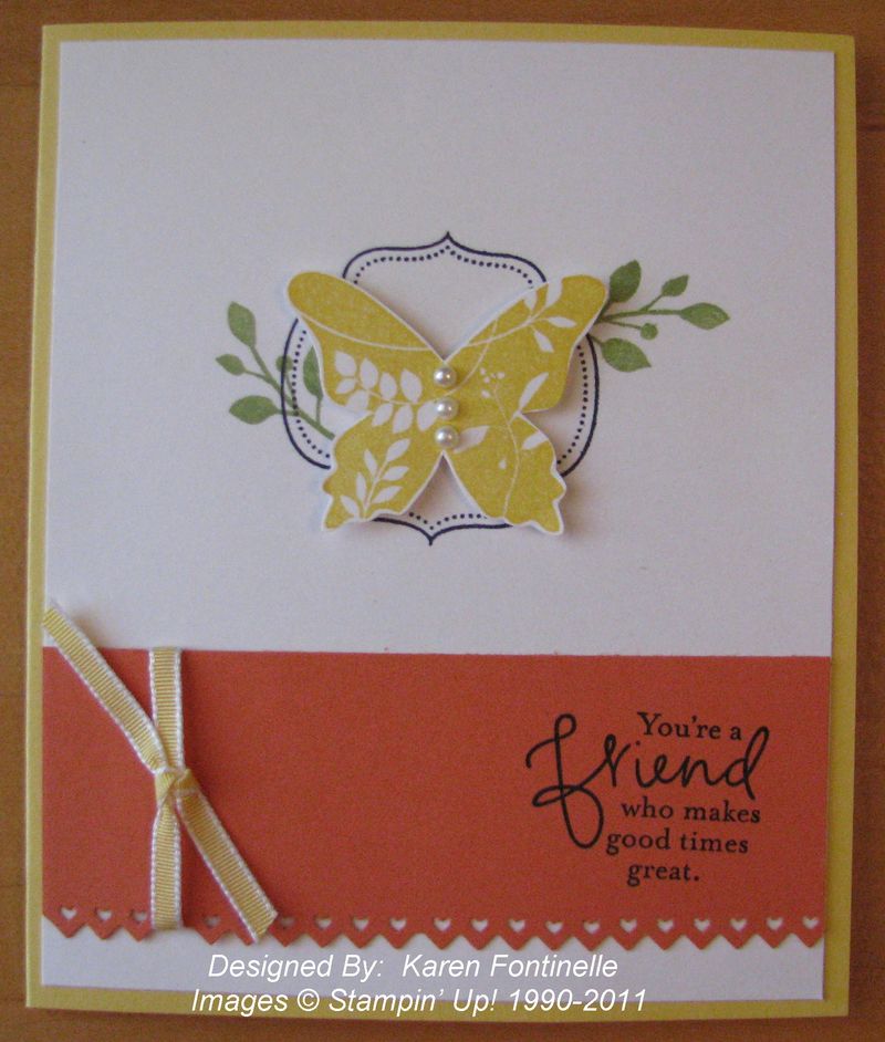 The stamp set Great Friend #113792 is one of the many Stampin' Up! stamp sets retiring the end of this month. I like this stamp set because it is very simple but lovely and versatile for many occasions. It also has a "for you" greeting which can be used for most anything. You could even color just the word "friend" on the stamp I used with a Stampin' Write Marker if you wanted to stamp just that word. The frame, the leaves, the butterfly are all so easy to use. To make this card, I used the sample card in the Stampin' Up! Idea Book & Catalog on page 122 as inspiration and changed it a little. I really like this simple card.