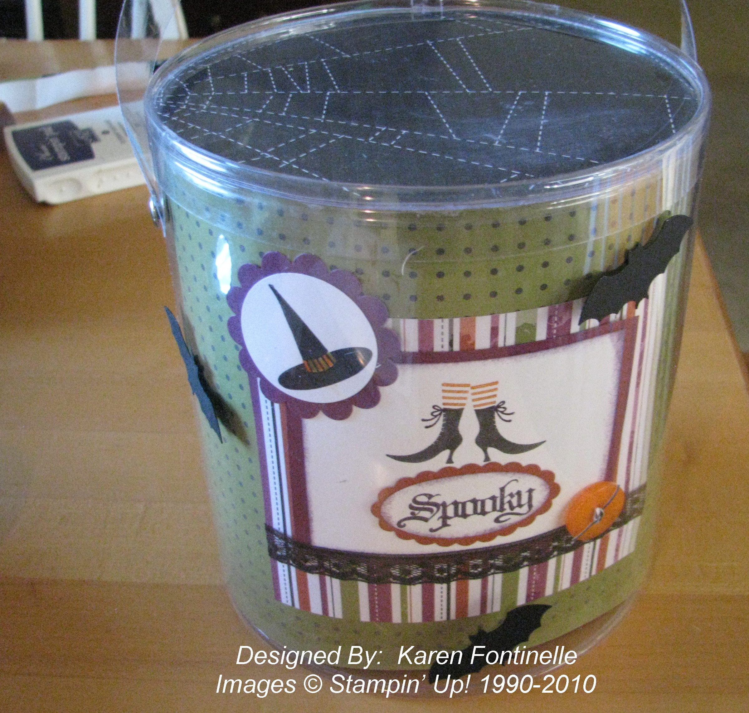 Here is one of the many things I have been doing lately to get ready for the wedding. These are the favor tins partially decorated and being shipped off to the bride to fill and finish. When I was left with the plastic buckets the tins came in I thought, THROW THESE OUT SO THEY DON"T ADD TO THE MESS! But then the craft devil said, "But you might be able to use these to wrap Christmas presents!" Isn't that always the way it happens and then we wind up with all kinds of stuff saved "in case we need it"! And then I got the idea to take out the paper lining the clear plastic container and decorate it for Halloween!