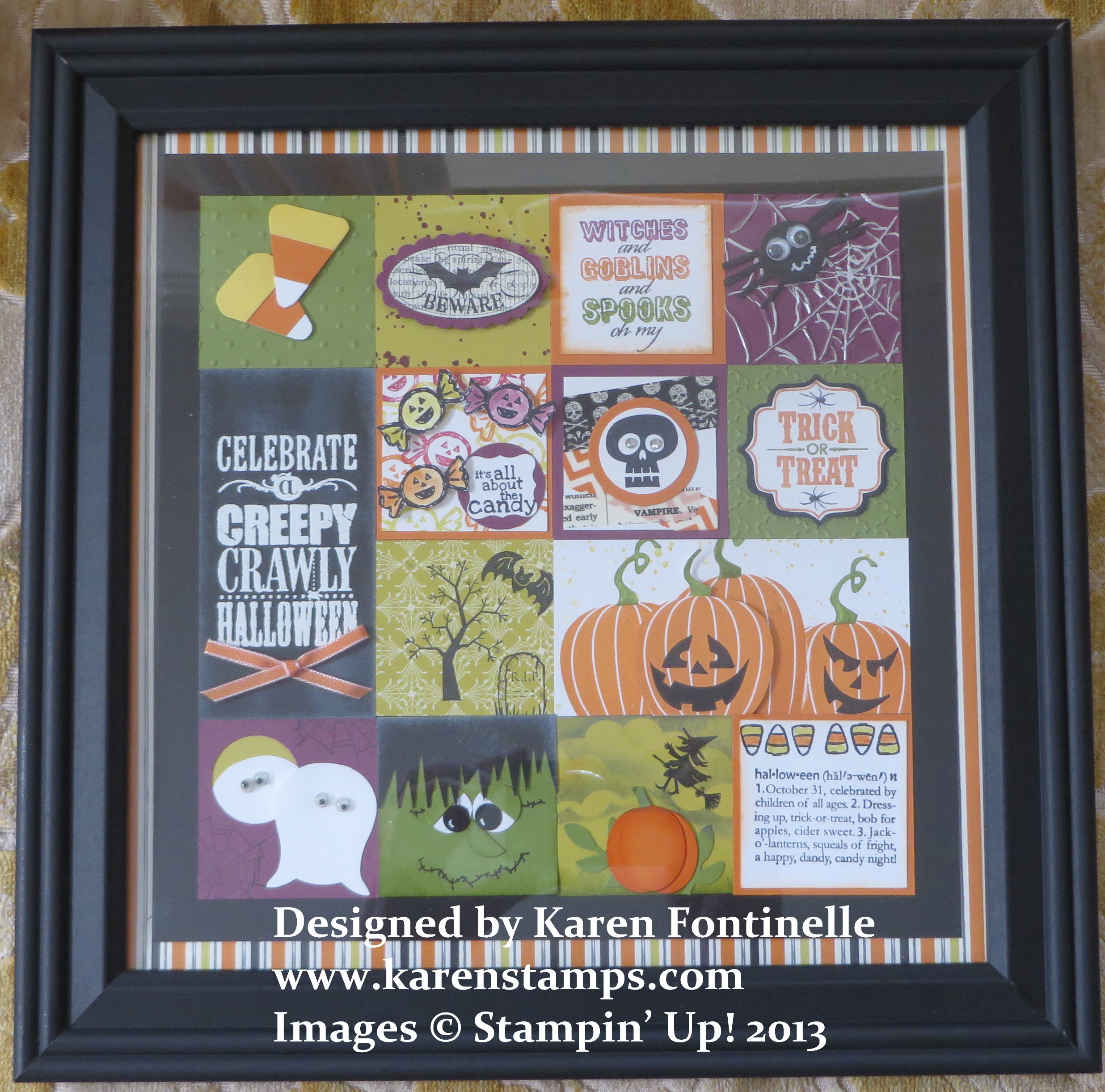 The Halloween framed art above was a gift for my friend we were visiting. I happened to have a frame with a square opening of 10″ x 10″ so I was able to use 2″ squares for the “art”. As you can see, I made two elements 2″ x 4″ to fit into the design. Some of the stamps were retired ( I couldn’t resist going through some of my “old” Halloween stamp sets) and some designs were ideas I got online or at least got me started on my own ideas. It was fun to make and an easy project for anyone to make. Make it as small or large as you want. Check to see what picture frames you already have in your stash and start there. You could do something with four squares or 16! Whatever you like! There’s a glare because I did put the glass in the frame but you can also omit the glass, especially if you want to put a lot of 3D layers on your art.
