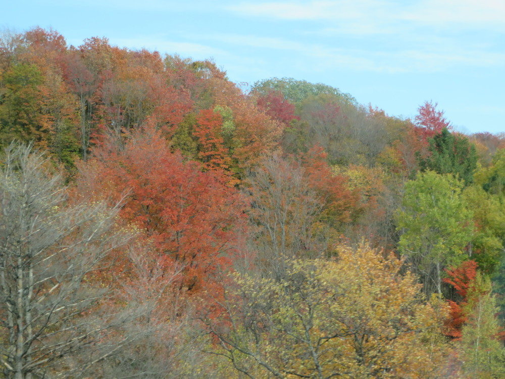 I’ll tell you more about my trip when I get all the photos sorted out. The trees were unbelievably gorgeous – if they weren’t at “peak” color, I don’t know how they could be any more beautiful. A lot of my photos were shot through the car windshield or passenger window, sometimes through the windshield wiper and raindrops! Here’s a sneak peek of some trees along the highway when we first arrived! I just held my camera in my hands at all times as we were driving!