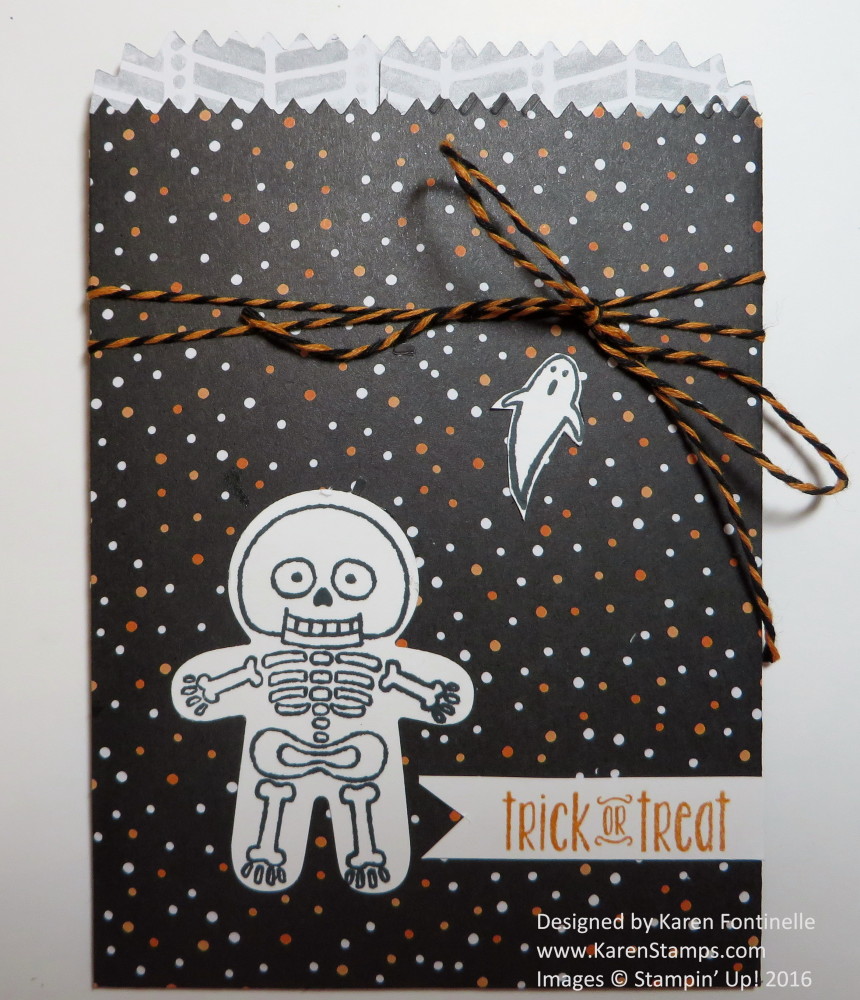 On this Halloween mini treat bag, I used a piece of the Halloween Night Specialty Designer Series Paper for the bag. You could really use either side of the paper for this project! I also stamped the skeleton in the Cookie Cutter Halloween Stamp Set and punched out with the Cookie Cutter Builder Punch. So easy! Then I stuck him on the front of the bag for decoration as well as tying around some Halloween Night Baker’s Twine. The greeting is stamped from the Spooky Fun Photopolymer Stamp Set and made into a little banner. The ghost I thought would be cute, from the same stamp set!
