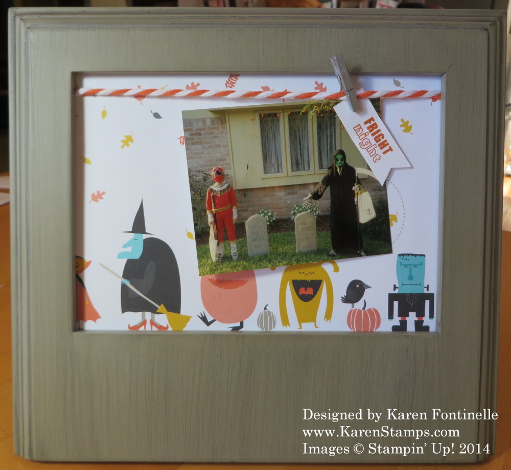 This Halloween Picture Frame is from last year, but I thought I would post it as a reminder of something fun you could make. This is a piece of Halloween paper from last year (Motley Monsters) placed inside a picture frame. Then I took a piece of Tangerine Tango Two-Toned Trim (which you can still buy on the Clearance Rack and also in Old Olive) and strung it across the top of the frame opening (I took out the glass). Just clip on a photo or two or three with a Mini Metallic Clothespin and maybe a little greeting or Halloween decoration. You can use any designer paper, Halloween pattern or something similar (you could use a print or polka dots or stripes in Halloween colors, too).