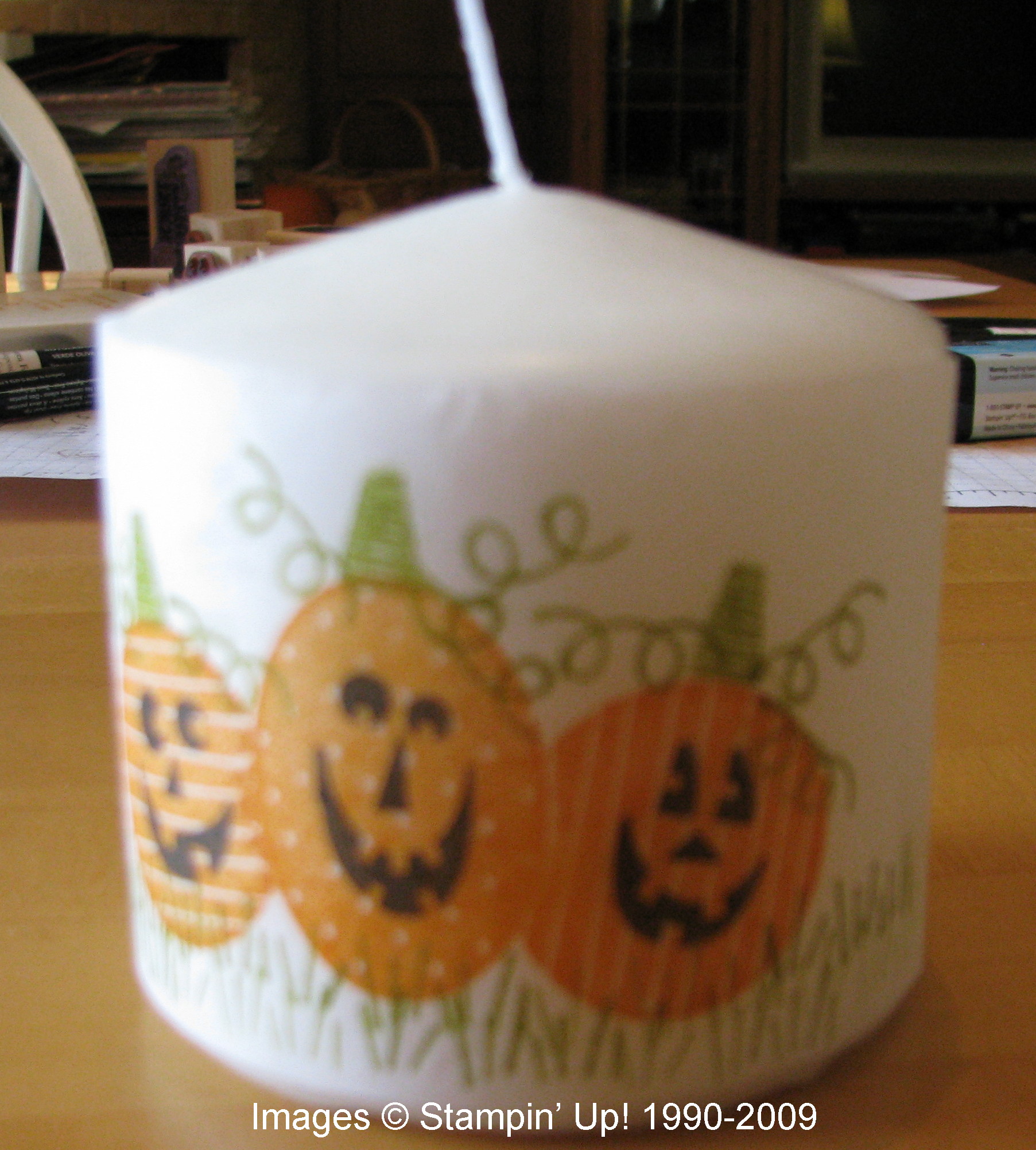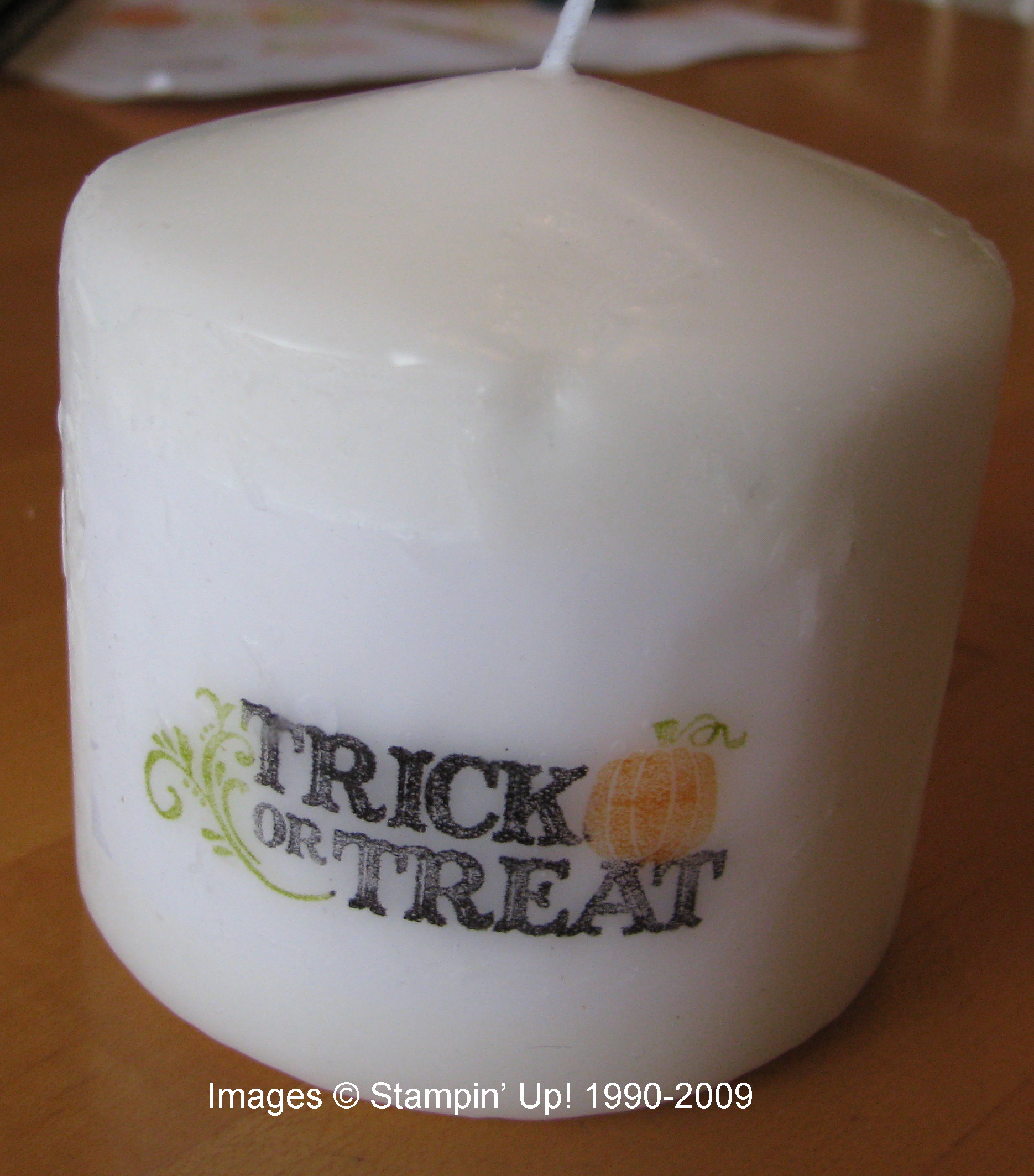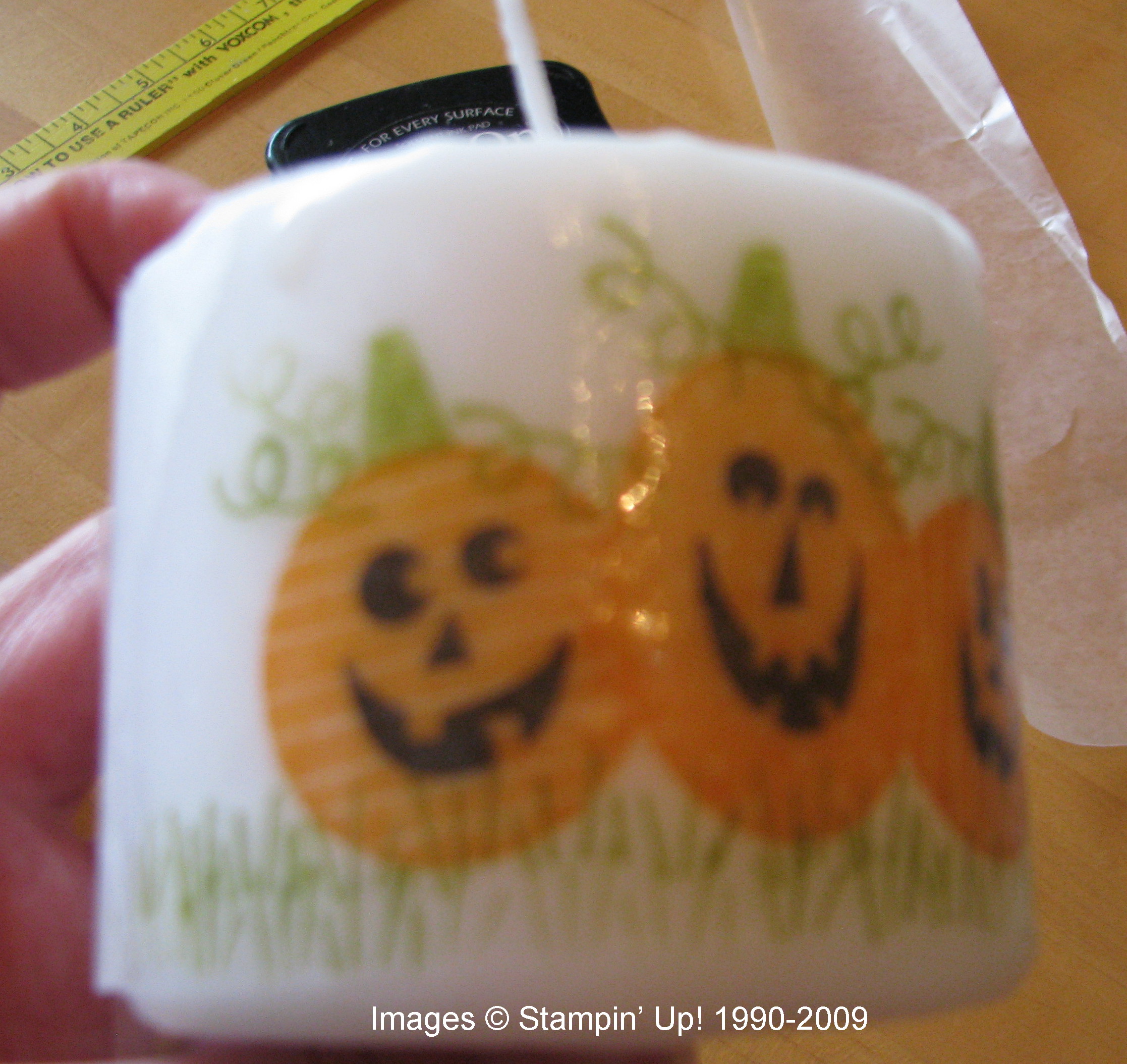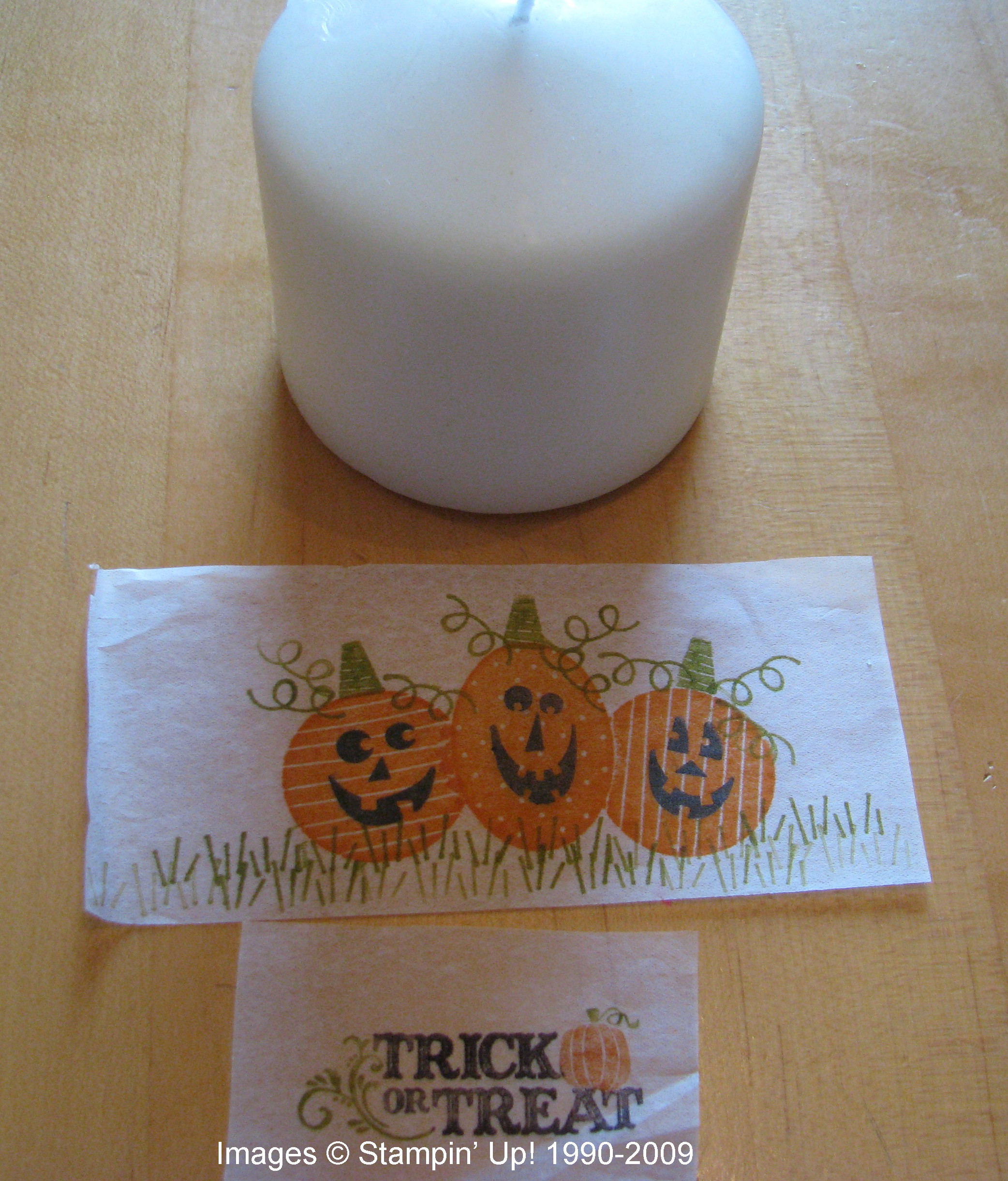 After getting out my Halloween decorations yesterday and some candles, I remembered this old technique from several years ago of how to stamp on candles! Actually you stamp on tissue paper and then heat and melt it into the candle. Pretty easy, really. Here I have taken you through the steps.
