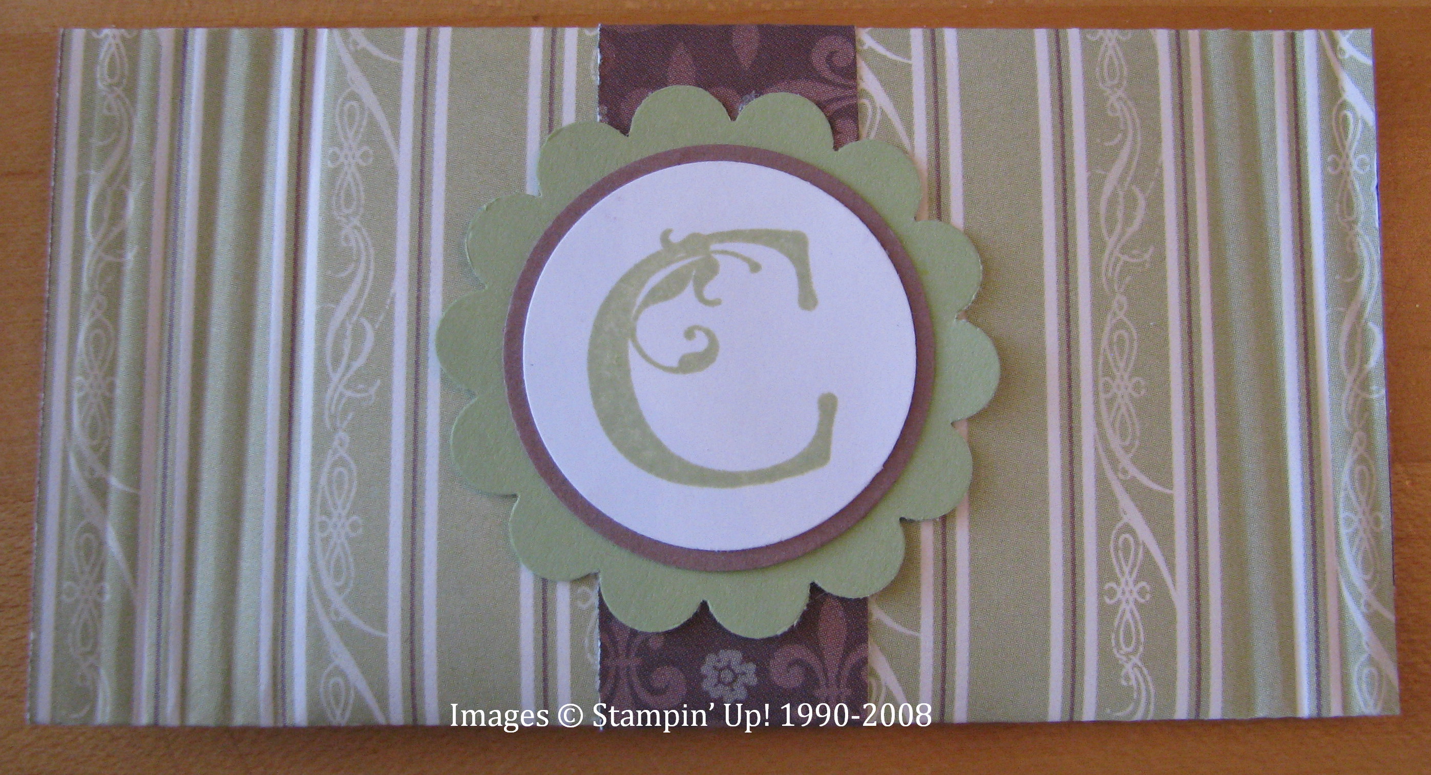 To decorate the package, I stamped her initial with the wonderful stamp set, "Lovely Letters" and used the circle punches and the Scallop Circle Punch. The belly band is just a piece of the coordinating designer paper. Both ends are crimped with the "crimper" on page 192 although it doesn't show up very well in this photo. The Crimper has been around as long as I can remember but it sure has its uses!