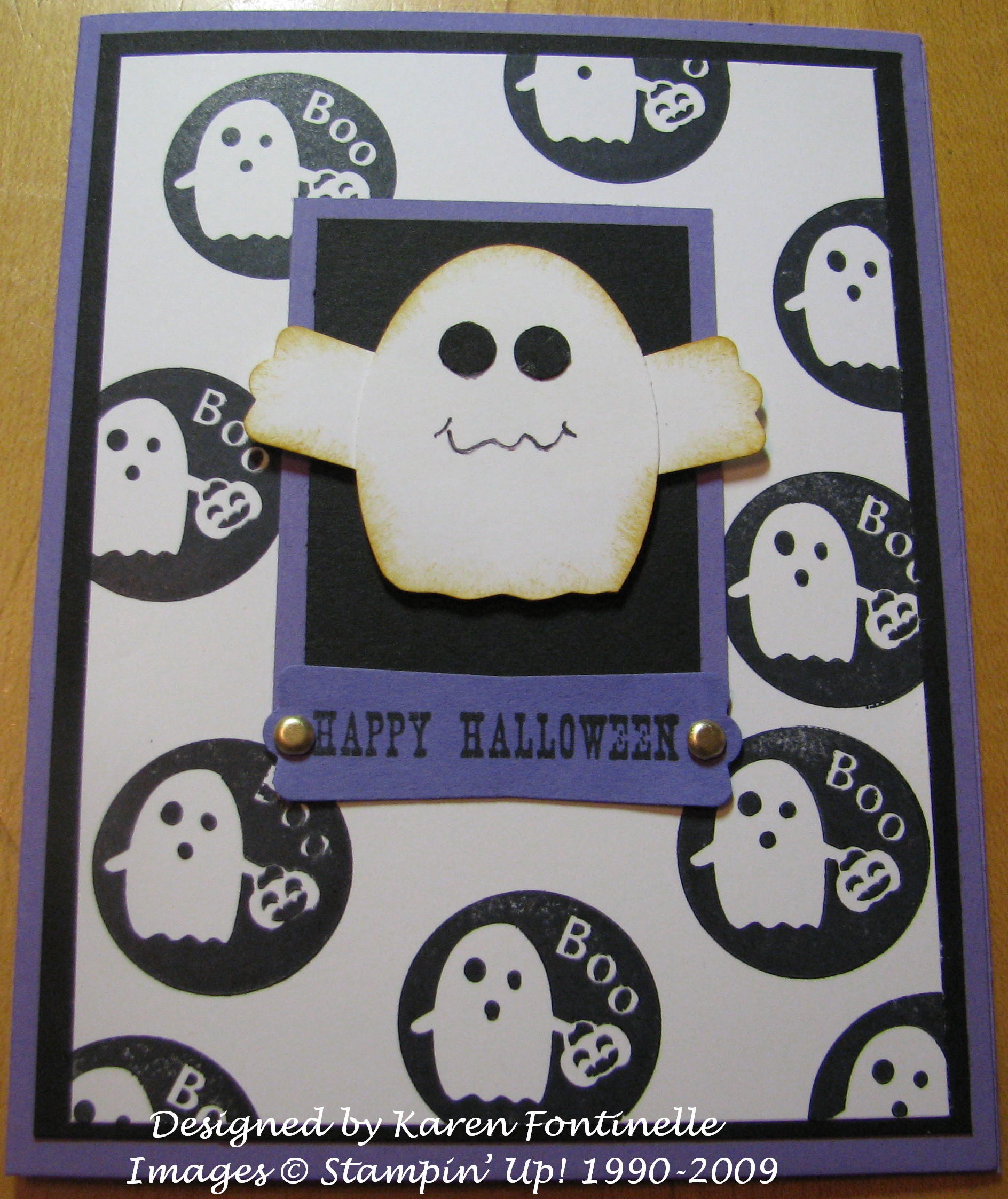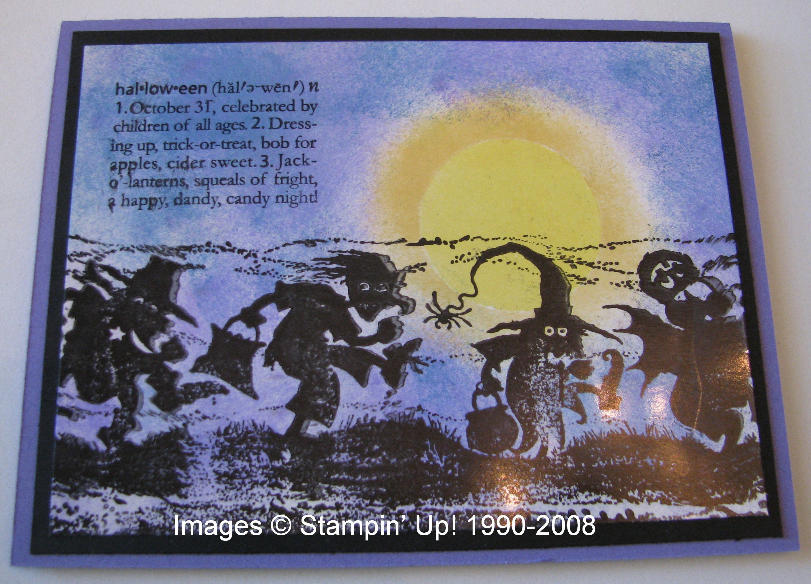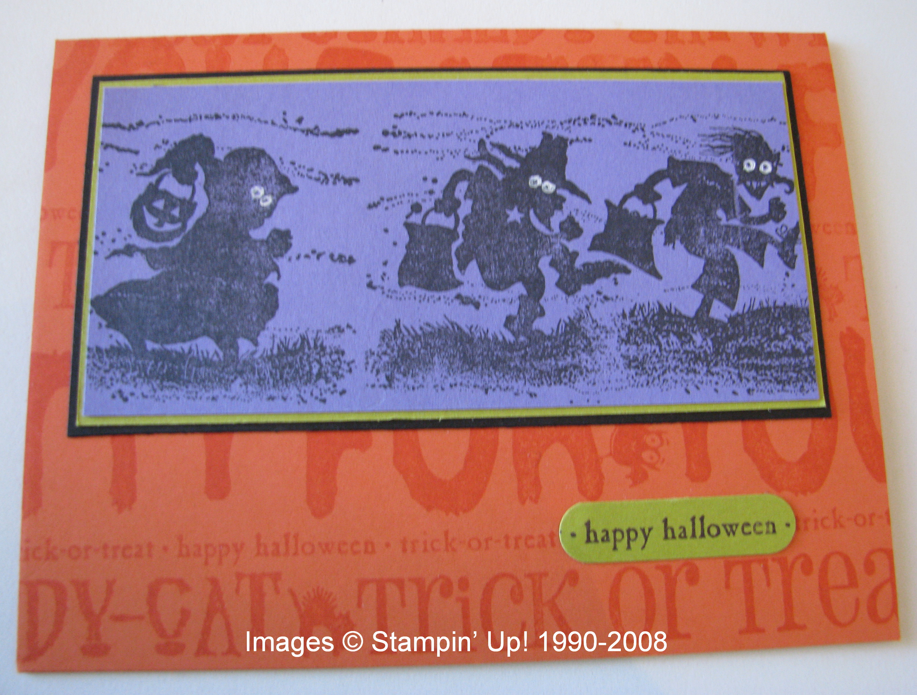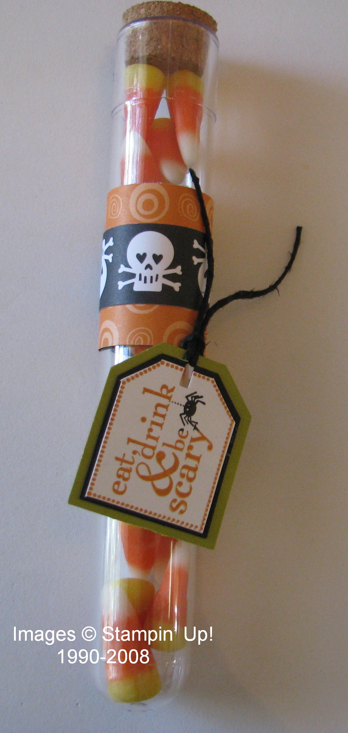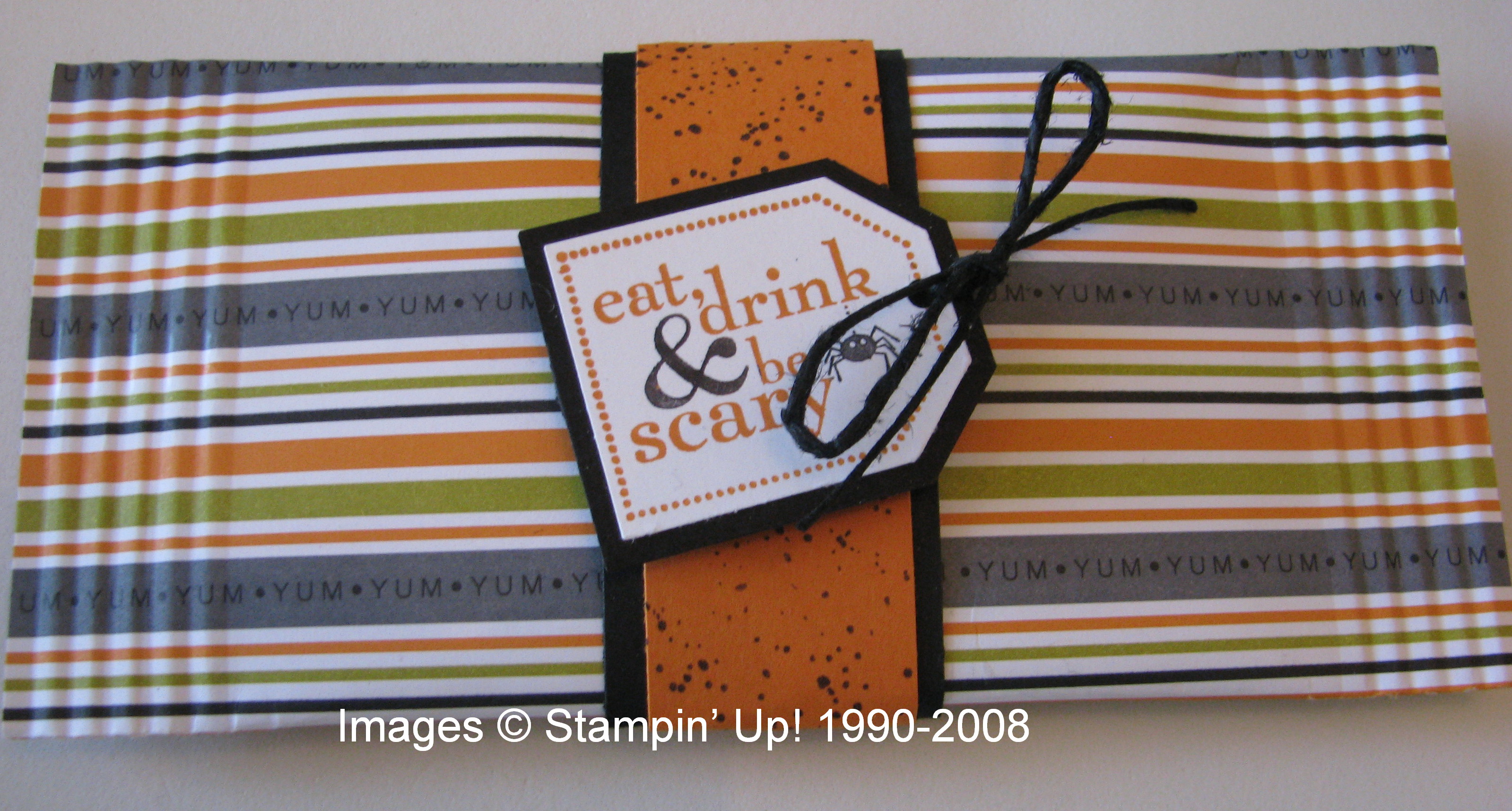 This is a 6×6 piece of the Halloween Designer Paper (page 170) in the Idea Book & Catalogcalled "Ghostly Greetings". You'll need a piece of Sticky Strip tape along one side at the edge, and I just used some SNAIL on the two sides. I placed a small bag of candy in the center and folded the side with no Sticky Strip down over it, like when wrapping a package, and folded the side with the Sticky Strip up to adhere. The two ends are then crimped which helps hold them shut while also adding interest to the package. I added just a simple "belly band" with black and Pumpkin Pie cardstock and stamped with that old favorite, "Itty Bitty Backgrounds"! The tag is stamped with the new set in the Holiday Mini on page 5 called "Eat, Drink & Be Scary" and has a little bow made with the SU black hemp twine. So easy and too cute!
