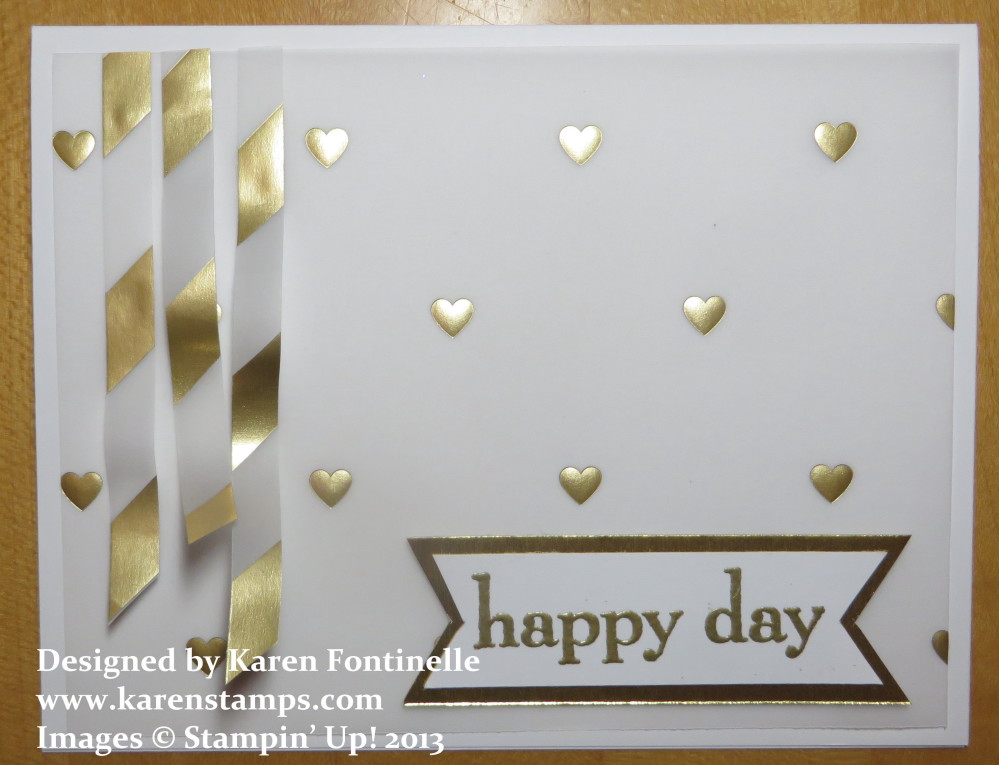 Here’s a card I made for the gold and shiny New Year! It’s a piece of new Fancy Foil Designer Vellum #133363 coming in the new Occasions Catalog in two more days! I used one piece with little gold hearts as the layer over Whisper White card stock for the card base and cut some strips of the striped vellum for little banners. The greeting is from the stamp set Happy Day, backed with a piece of Gold Foil.