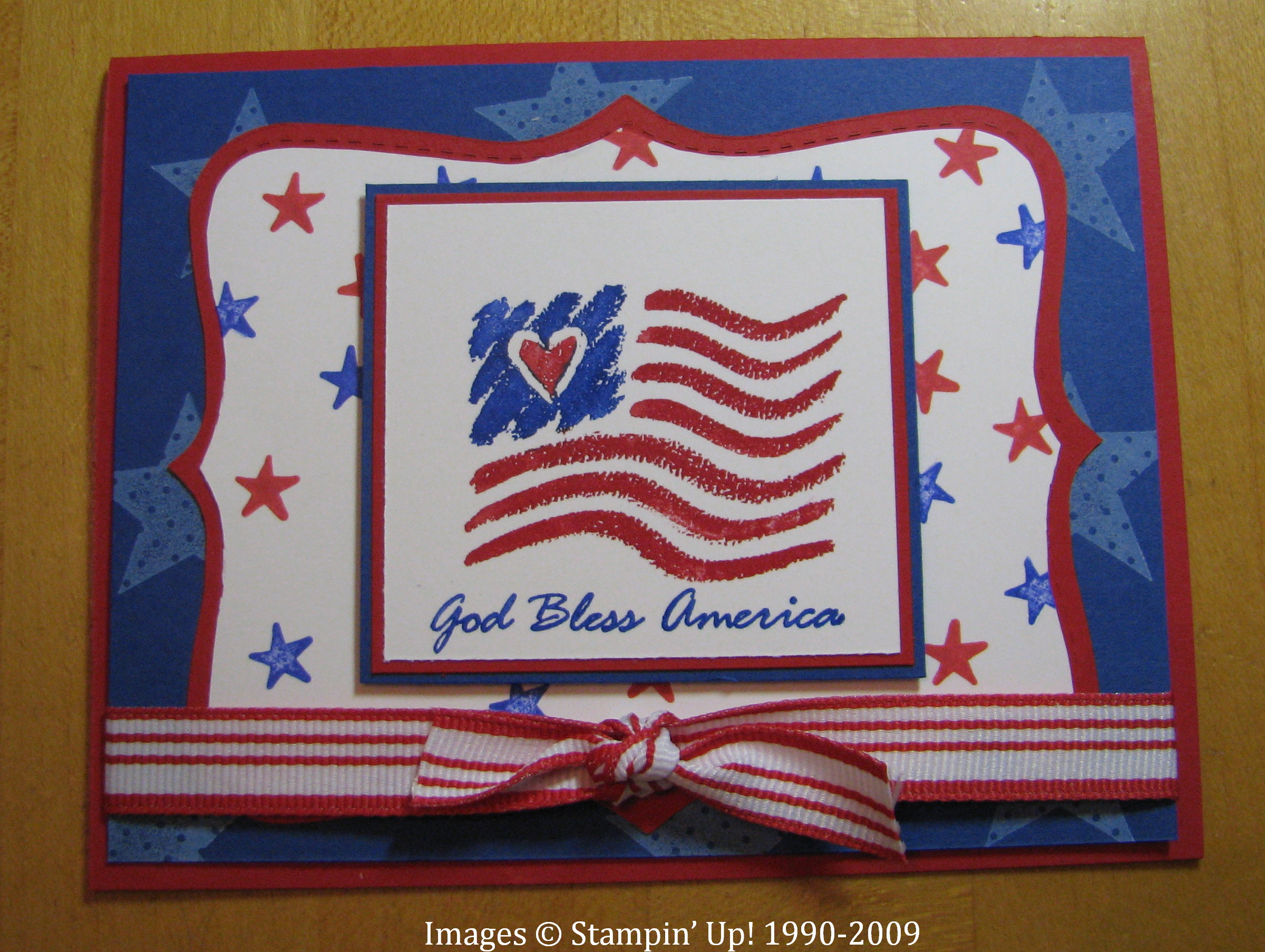 Although the stamps used on this card are retired, I hope you enjoy this patriotic card for Memorial Day. You probably have something similar if you wanted to duplicate this card or one like it. The focal point of this card is the "God Bless America" stamp by Stampin' Up! This was a special edition single stamp released by Stampin' Up! in remembrance of September 11, 2001. The entire purchase price of the stamp was donated to the September 11th Fund created by the United Way and the New York Community Trust to provide services for the victims and their families. I wasn't even a demo when the stamp came out, just bought it from my upline as a customer, although it wasn't long until I became a demo. I used my Stampin' Write Markers to ink up the different parts of the stamp. The other stars on the card are from a retired stamp set "In the Stars". I used the Top Note die with the Big Shot, cutting out one in white and one in red and trimming the white along the score lines to fit as a layer on the red. The ribbon is current and is the 1/2" striped grosgrain in Real Red.