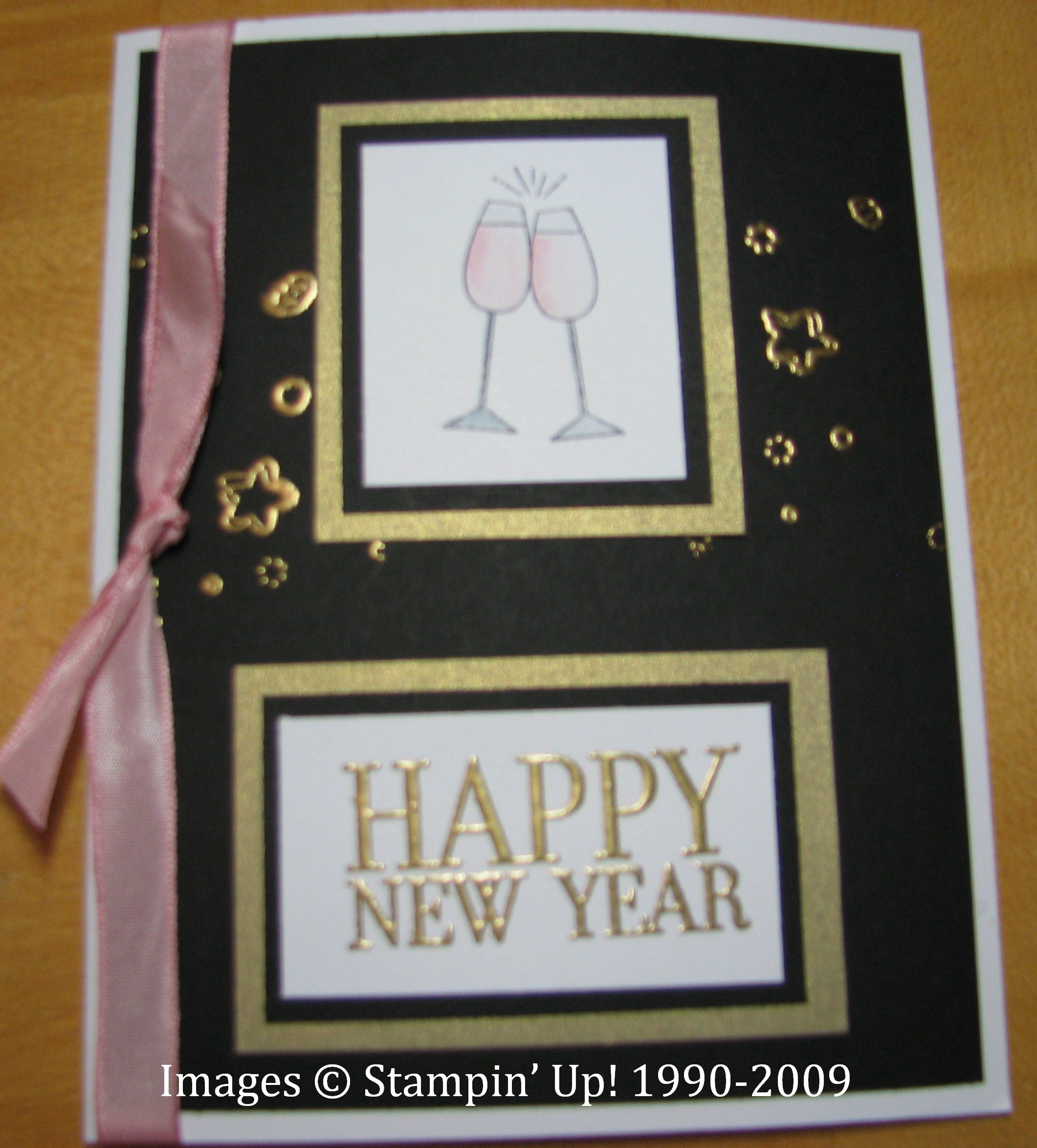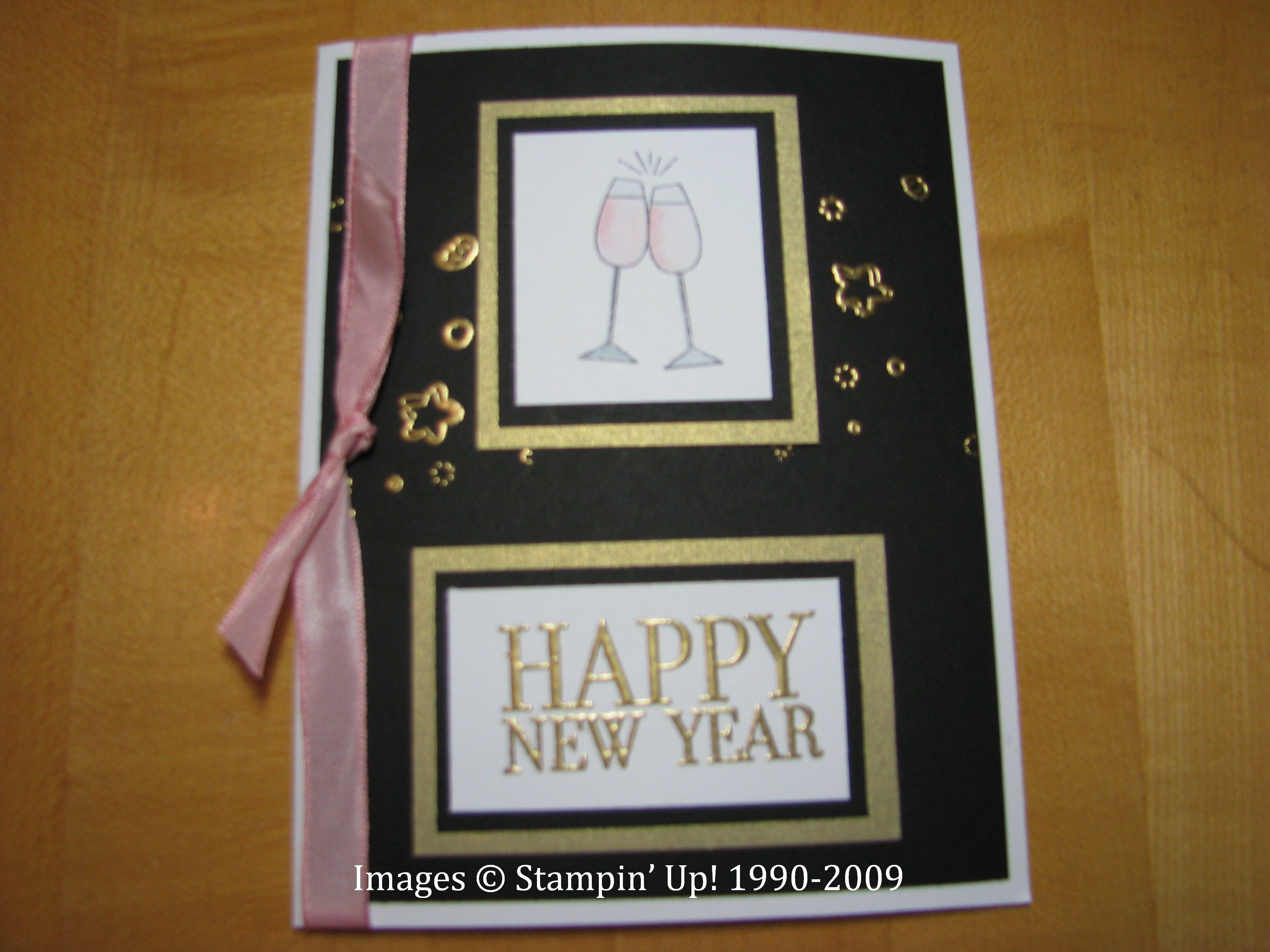 I was actually making this card at the stroke of midnight to wish you all a Happy New Year!! Thought I would start out the New Year right…..stamping!! I hope you all had better champagne than we did….ours was terrible….so I made pink champagne on this card, thinking it would taste better! Love the cute "Cheers to You" stamp set and the "Holidays and Wishes" for the greeting. A little gold embossing and a wheel with "Sweet Stars". The gold elastic cord in our Holiday Mini would have looked great but I was in a pink taffeta mood tonight!