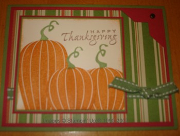 Here is another Thanksgiving card I made and then didn’t send! It is pretty much entirely copied from another wonderful demonstrator whose name I do not have handy at the moment. I used the Carved and Candlelit stamp set for the pumpkins of course. I love the new designer paper, Apple Cider, in the new Holiday Mini catalog. You can click on any of the highlighted words for a link to the catalog. Remember, the Holiday Mini is only good until the end of November! It has beautiful things in it for the holidays. I also used the beautiful Wild Wasabi Double-Stitched Ribbon available in the Fall/Winter 2007 Collection catalog.