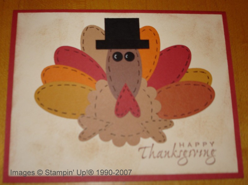 Happy Thanksgiving Everyone! This is a fun card I made with Stampin’ Up! punches! I was inspired from lots of different demos’ versions of making a turkey with punches. I think my only original contribution was using the Scallop Circle Punch for the body! He was fun to make! You can click on the photo to make it larger. I only wish I would have mailed it out to someone to enjoy for Thanksgiving! Obviously a lot of Oval punches were used for the tail feathers and head, which I did the dotted outline with a marker. You can either punch the hearts or cut out freehand for the waddle and the feet. The hat can be a square punch with a little scrap for the brim.