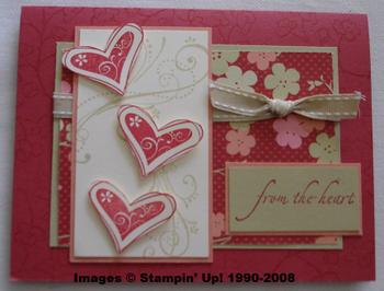 Here is another card we made at my Valentine’s stamp camp. I’m afraid I don’t remember where I got the idea or how much I directly copied it, but I "think" a little of it is my own design….maybe just the words! I love the card because while it looks like it is for Valentine’s Day it really can be used for other occasions. In fact, I sent it to my sister-in-law for her birthday. The card is made with Ruby Red, River Rock, Groovy Guava, and Very Vanilla cardstock as well as the new Designer Paper "Ginger Blossom". To add some interest to the background I stamped the Ruby Red with some flowers in Embrace Life with Ruby Red ink (although you could also use Versamark). The swirls from Priceless (what a great set this is!) are stamped on the Very Vanilla and the Priceless hearts cut out and mounted with Stampin’ Up! Dimensionals. The words, ‘from the heart’, are from Holidays & Wishes. And, of course, the ribbon is the double-stitched River Rock. It was fun using these colors!