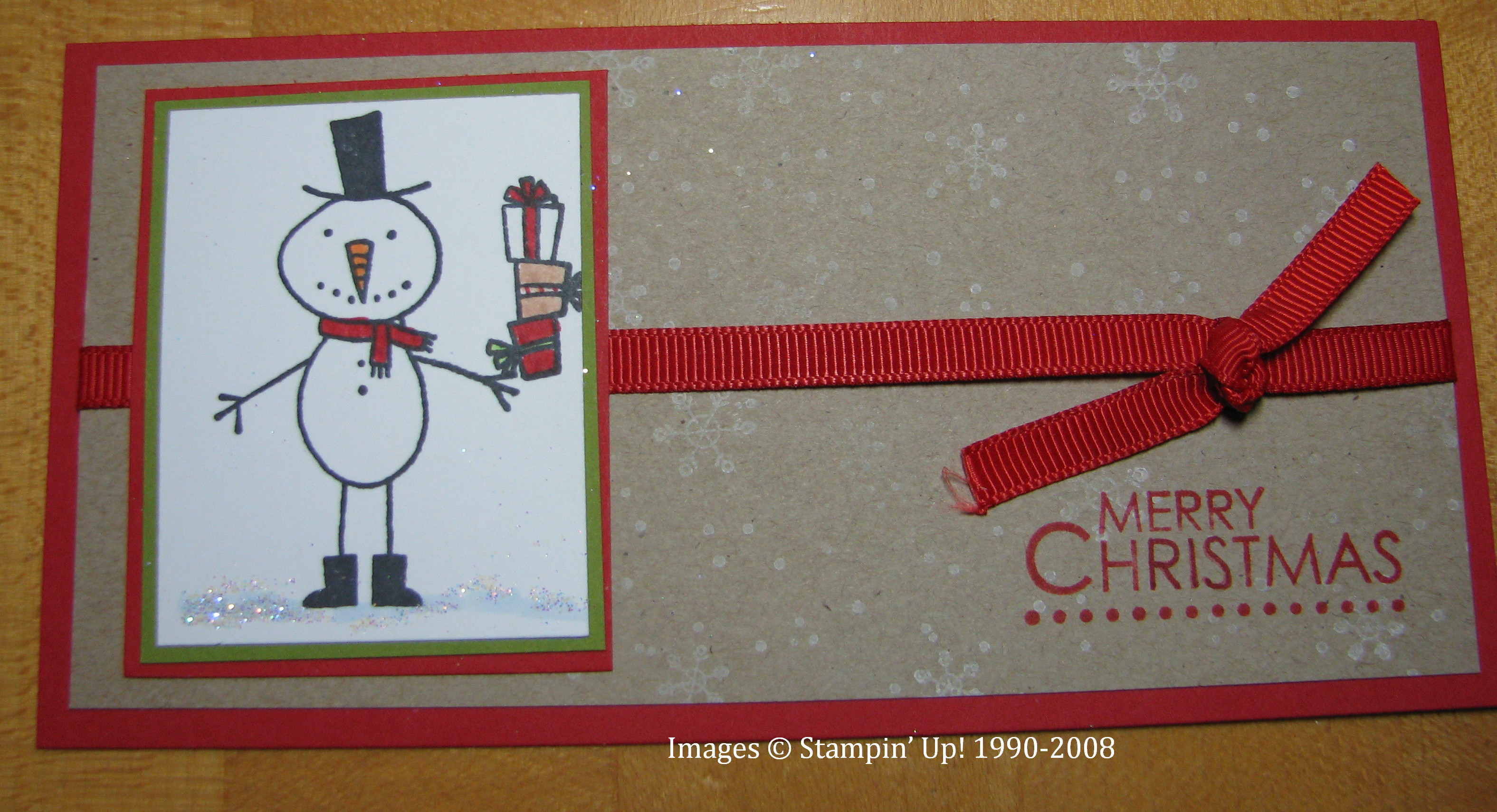 And this one is the famous "Mr. Twigster" in the Holiday Mini. I guess you either love him or hate him since lots of people say snowmen don't have legs. But he was quite popular as a swap yesterday and I enjoyed making the card! I used the snowflakes from "Merry and Bright" and stamped with white Craft ink. The greeting comes from "Season of Joy". I added a little Dazzling Diamonds Glitter for the snow at the feet of Mr. Twigster after coloring just a little bit of blue ink with my Aqua Painter.