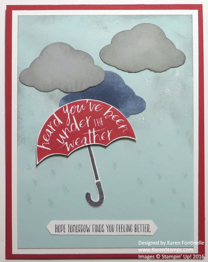 Next I actually used the My Hero Stamp Set. I stamped the umbrella on Whisper White cardstock with Real Red ink and cut it out with my Paper Snips. The umbrella handle is stamped with Basic Gray and cut out. I adhered the clouds to the top of the card and next the umbrella, popping up the umbrella with Stampin’ Dimensionals. The little greeting at the bottom is from the stamp set and punched out (just the ends) with the new Classic Label Punch. You could also put this greeting on the inside of the card.