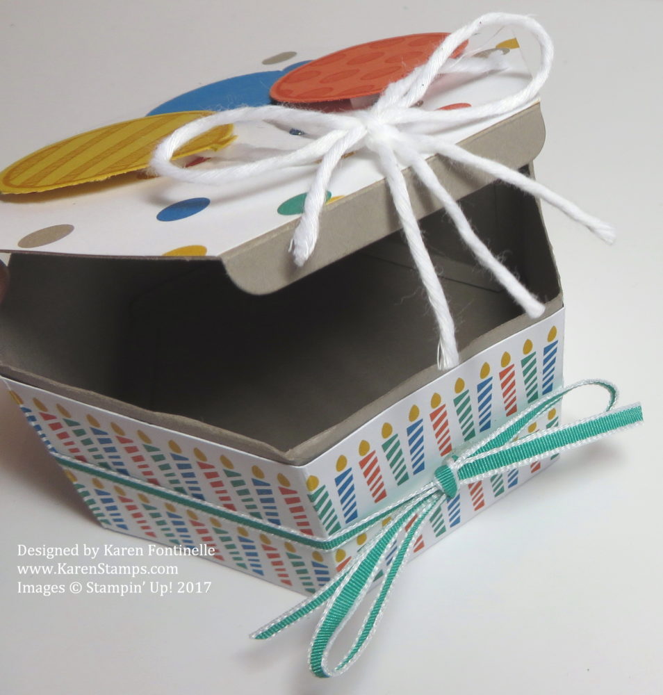 On this box, even though it has those decorative dies to use, I opted to just make the basic box and then decorate it with designer paper and balloons for a birthday! You can make these boxes for ANY occasion or holiday! I’ve even seen them online where it is like they are stacked to make a taller box. I’ll have to learn about that and try it! After I made the Hexagonal Window Box, I die cut a piece of the polka dot paper in the Party Animal Designer Series Paper package with just, the lid portion of the basic box die. Then I cut along the score lines or slightly inside, so that it would fit on the top lid of the box. Around the side of the box, I cut a strip of the candles pattern paper to go around. Luckily a 12″ strip does fit and even overlaps a little on the back. For the candle pattern, I cut it so that the candles themselves would be fully pictured, which meant I first cut off a strip on the edge that just had partial images of the candles. My strip is 1 3/4″ wide, but you can make yours narrower if you like depending on the pattern or look you want. Another choice would be to stamp on the box before you assemble it. After I had the paper around the side, I tied on some 1/8″ Taffeta Ribbon in Emerald Envy. For the top of the box, I stamped and punched three balloons with the Balloon Adventures Stamp Set and the Balloon Bouquet Punch. I attached some Whisper White Thick Baker’s Twine to the balloons and tied on a bow. If I hadn’t tied the bow, I might have put a “Happy Birthday Banner” instead. This Hexagonal Decorated Birthday Gift Box is a cute box and can be made in any colors for any occasion. It’s big enough for a small gift or some candies or treats.