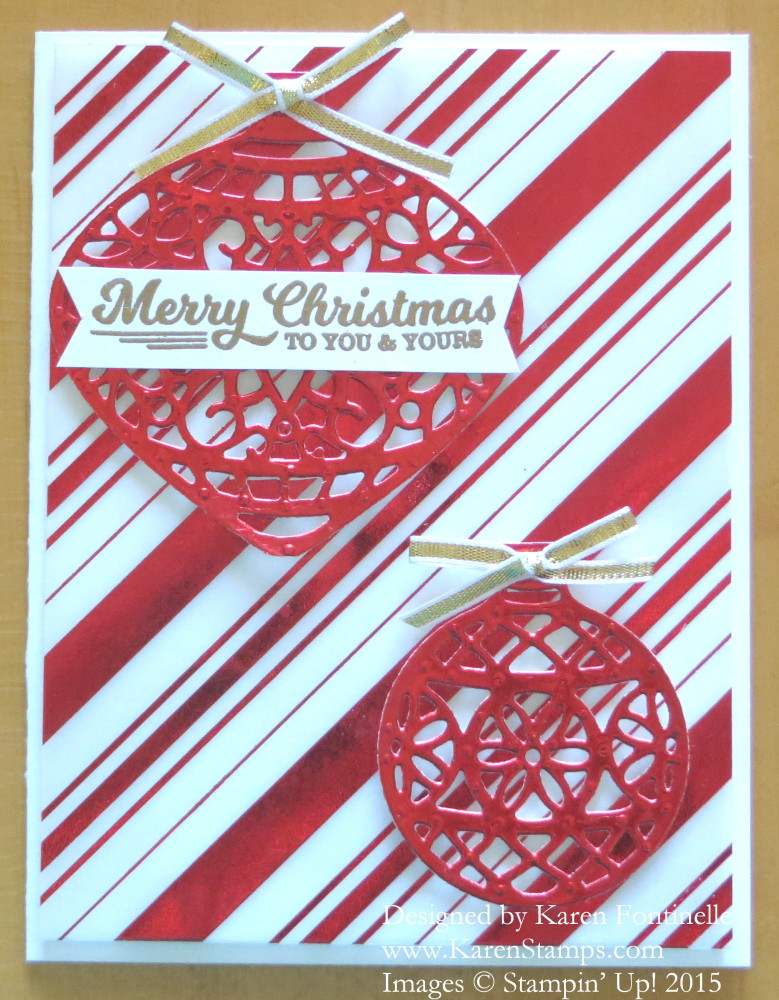 You can use this design idea in many ways, just by stamping ornaments on card stock or stamping and cutting out the ornaments and adhering them to the card front, or adding some different designer paper in the background. So many easy ways to make a card!