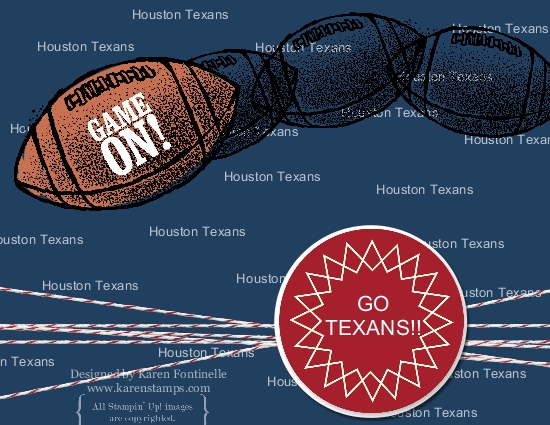 In honor of the Houston Texans, I made this spirit card in My Digital Studio, the Stampin' Up! software program for digital papercrafting. I made my own "designer paper" background by typing "Houston Texans" in a text box, changing the color to white, lowering the opacity, and copying and pasting the text box all over the page! Since I didn't have a football digital stamp, I was able to go to Stampin' Up! and order it online and have the download in seconds! Really cool!!