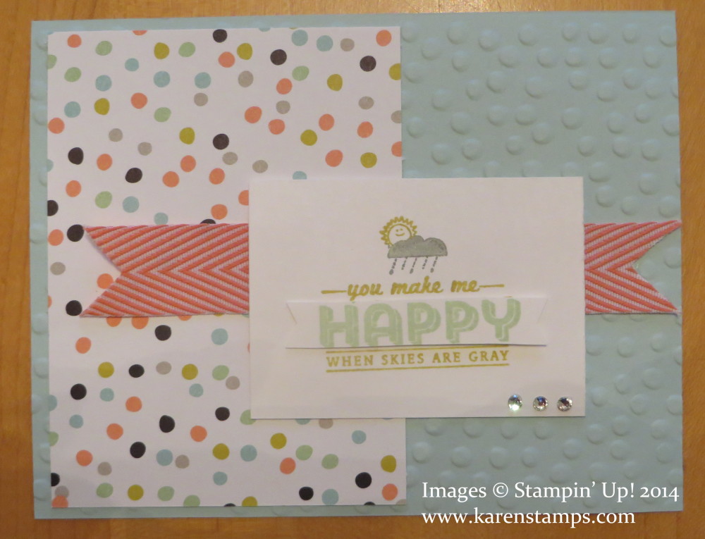 Here’s a Stampin’ Up! Sale-A-Bration swap from Valerie. And certainly skies are gray here in Houston! But this cute card will cheer us up! Sale-A-Bration begins Tuesday, January 28! With a $50 purchase in any current Stampin’ Up! products, you will earn a FREE product from the Sale-A-Bration brochure. You might choose the cute Decorative Dots Embossing Folder you see on this card, the cute Sweet Sorbet Designer Series Paper, or the stamp set See Ya Later used in the greeting!