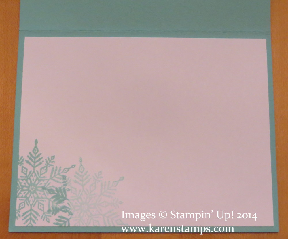 Here’s the perfect card to show you from my Leadership swaps! The snowflakes and sentiment are from the Stampin’ Up! 25th Anniversary Best of Snow stamp set! This card is made by Nancy and here is the inside: