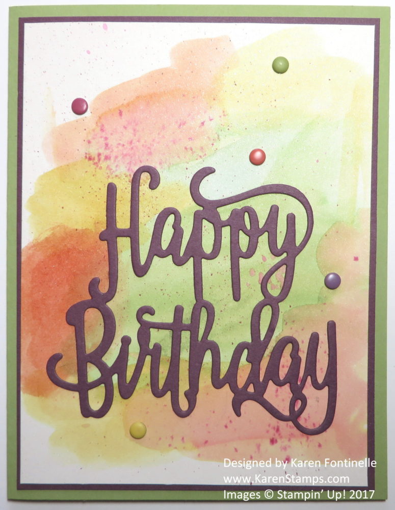 I highly recommend the Happy Birthday Thinlit Die because it is bold enough to adhere over a lot of different backgrounds yet very delicate and pretty. Try the watercoloring technique for a background for your card as a different way of making an easy watercolored birthday card.