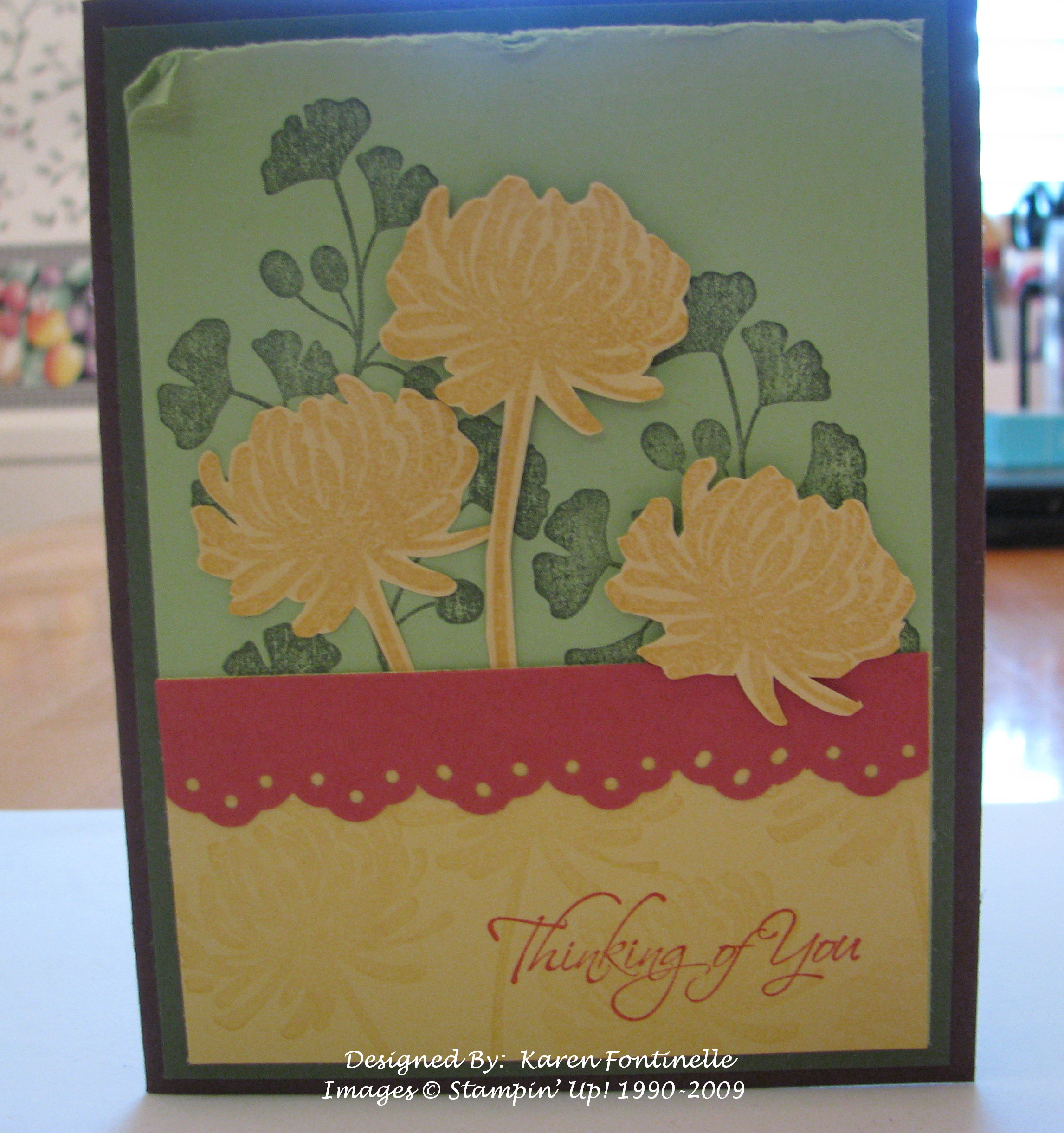 I was looking through the new Stampin' Up! 2009-2010 Idea Book & Catalog the other day (well, almost everyday!) and just saw lots of things I wanted to make. This card was inspired by the scrapbook page on page 16 of the catalog. That particular day I just liked the colors shown on that page and decided to make a card with the hostess set, "Kind and Caring Thoughts".