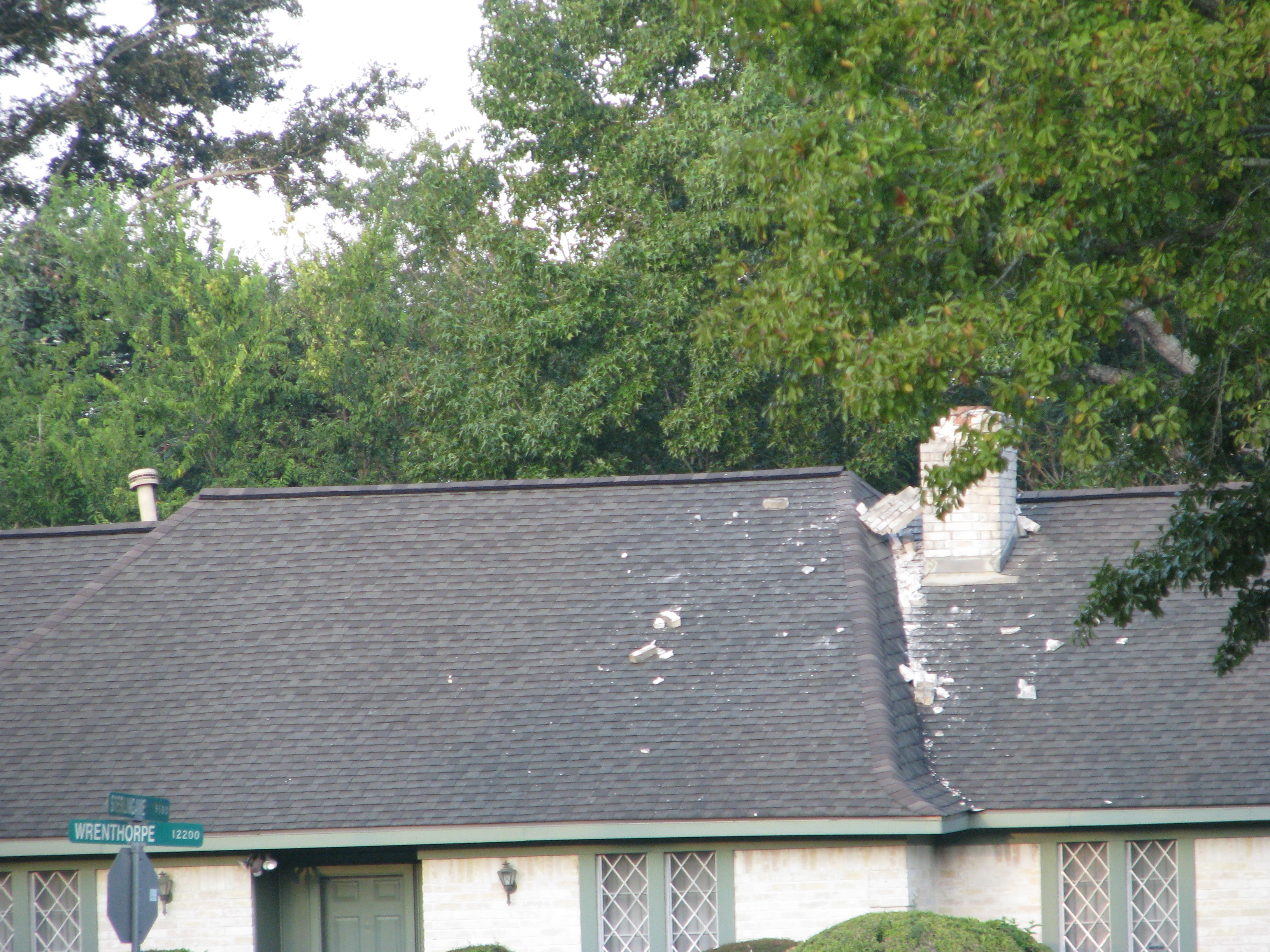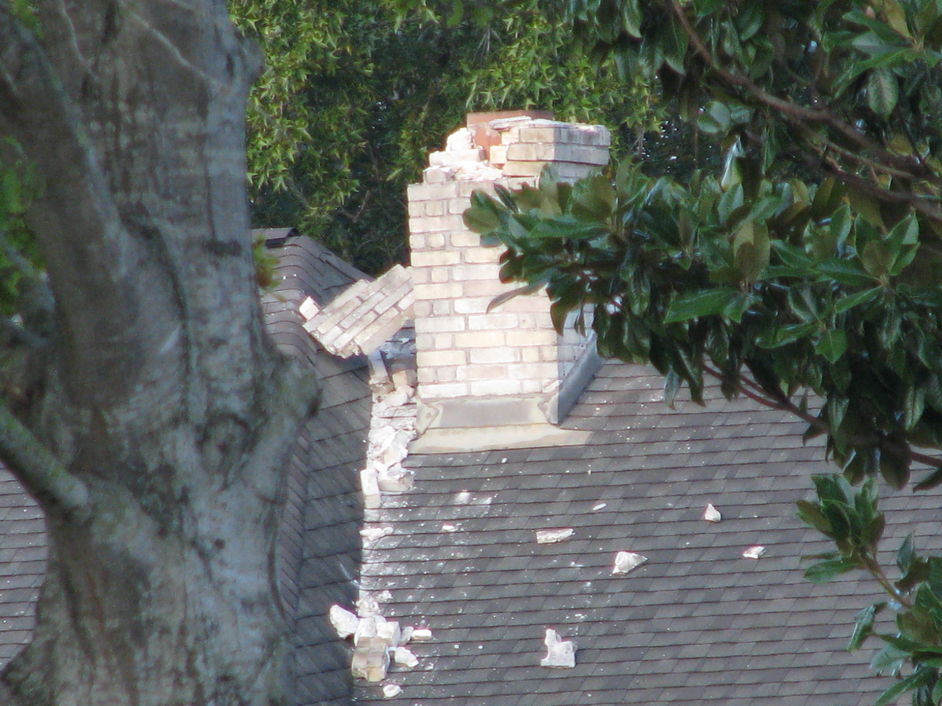 This past weekend we had several occasions where we had lots of lightning and thunder and yet not a drop of rain at our house. Some places in Houston did get rain but it was just wherever the storm popped up. On Sunday afternoon, my husband went out in the backyard to plant some seeds for fall in our pitiful garden. All of a sudden a little bit of lightning popped up….of course I am the only alarmist in the family who would worry about such a thing! In a few more minutes there was a very LOUD crack of lightning and I ran to the back door to make sure my husband wasn't sprawled out in the backyard. He was fine but hurrying to get inside. That lightning was way too close for comfort even for him! But it wasn't until later that evening that we discovered that lightning bolt must have hit the chimney on the house a few doors down on the corner! Look at these photos I took this morning of their chimney and roof!