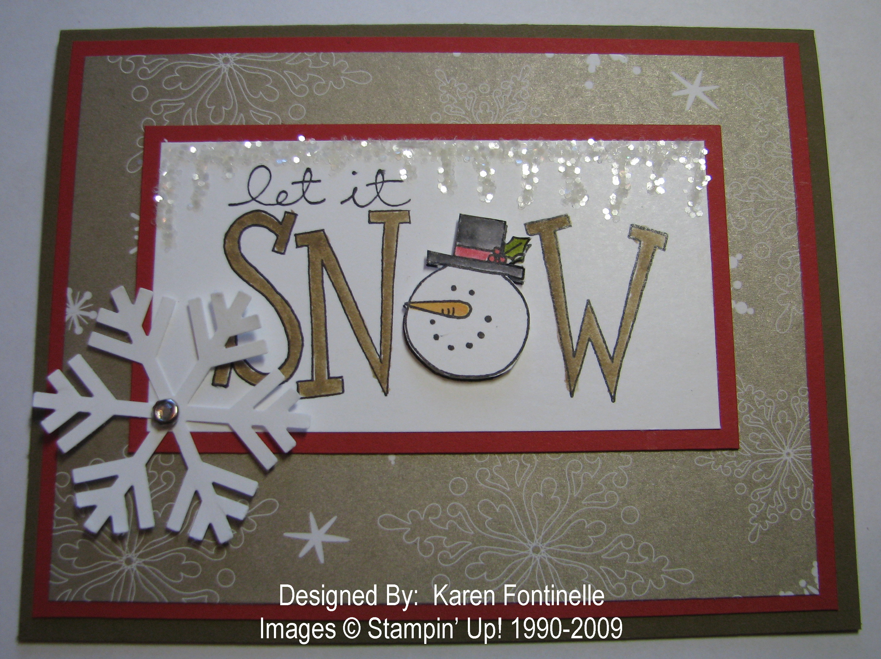 Amazingly, the forecast for Houston tomorrow is for SNOW!!!!!!!!!!! Now it might not ACTUALLY snow, but to even have mention of snow in Houston is beyond spectacular! It even has been pretty chilly here the last couple of days, jacket weather if you're going to be outside for more than a few minutes, so it makes a forecast of snow a little bit believable. Today the sun is shining but yesterday it was very cloudy at times, which made me feel like it could snow. Now the snow might not be any more than a few flakes falling as the rain changes to snow….or it might even be a couple of inches, some computer models say! But two flakes would be exciting down here in the tropics! Thus, I was inspired to make this card with one of my favorite stamp sets, Big on Christmas (#116578). I used Soft Suede for the card base, Real Red for layers, and the beautiful Christmas Cocoa Specialty Designer Series Paper (#116770) in the Holiday Mini. The snowflake is made with the Jumbo Snowflake Punch (#116628) with a very small Clear Rhinestone Brad (#113144) in the center. For a little extra dazzle I drew on some icicles with the Tombow Multi Purpose Adhesive and then sprinkled with the White Chunky Essentials Stampin' Glitter (#108797).
