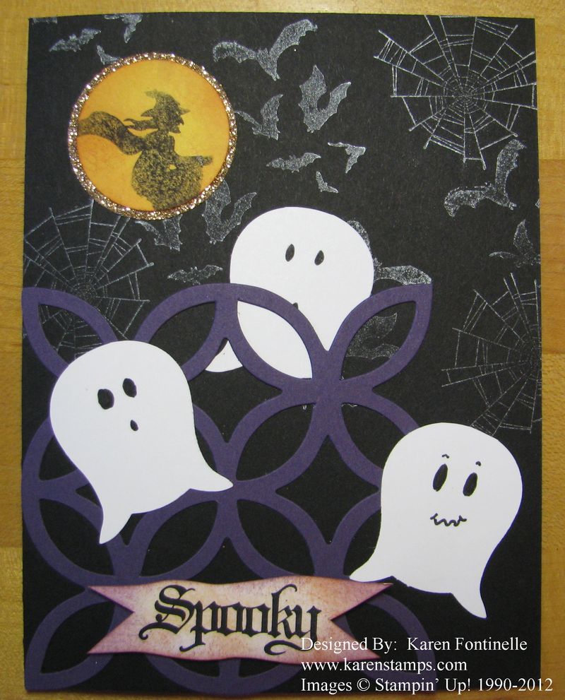 I almost don't remember how I made the moon, but maybe I just started with Whisper White card stock and sponged it with some colors, like More Mustard, Cajun Craze..maybe some Pumpkin Pie. You could try any similar inks. The I stamped a witch on the moon as if you would see her shadow on the moon as she flew by. The witch is from Toxic Treats in the Holiday Catalog but I just colored in the witch, not the whole stamp, with a black Stampin' Write Marker and laid the moon down onto the stamp of the witch. I like the kind of shadowy look I got instead of a crisp stamped black image.